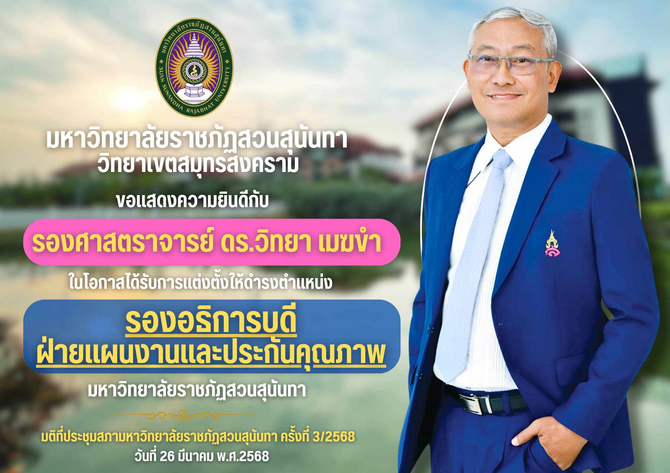 ในโอกาสได้รับการแต่งตั้งให้ดำรงตำแหน่งรองอธิการบดีฝ่ายแผนงานและประกันคุณภาพมหาวิทยาลัยราชภัฏสวนสุนันทา