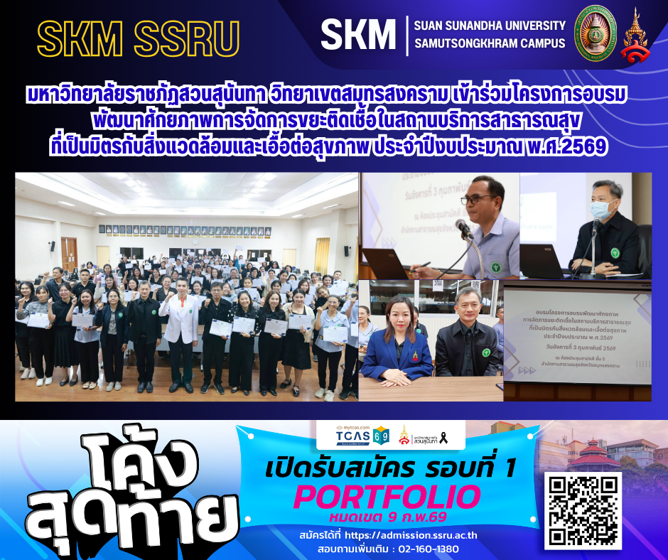 วันอังคารที่ 3 กุมภาพันธ์ พ.ศ. 2569 ณ ห้องประชุมสามัคคี ชั้น 5 อาคารใหม่ (พ.ศ.2564) สำนักงานสาธารณสุขจังหวัดสมุทรสงคราม มหาวิทยาลัยราชภัฏสวนสุนันทา วิทยาเขตสมุทรสงคราม นำโดย ผู้ช่วยศาสตราจารย์ ดร. เภสัชกรหญิงพิมพร ทองเมือง รองอธิการบดีวิทยาเขตสมุทรสงคราม ได้มอบหมายให้ นางสาวสุพรรณราย สงวนไทร รักษาการหัวหน้าฝ่ายอาคารและสถานที่ กองกลาง สำนักงานวิทยาเขตสมุทรสงคราม เข้าร่วมหลักสูตรการป้องกันและระงับการแพร่เชื้อหรืออันตรายที่อาจเกิดจากมูลฝอยติดเชื้อสำหรับผู้ปฏิบัติภายใต้โครงการอบรมพัฒนาศักยภาพการจัดการขยะติดเชื้อในสถานบริการสาธารณสุขที่เป็นมิตรกับสิ่งแวดล้อมและเอื้อต่อสุขภาพ ประจำปีงบประมาณ พ.ศ. 2569