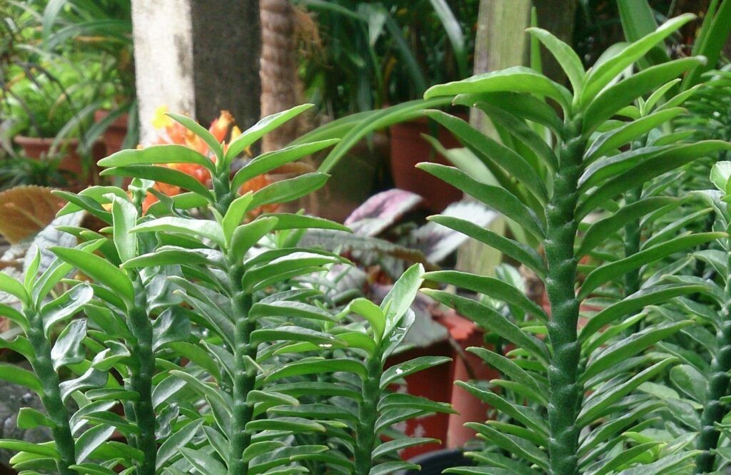 ใบ ใบรูปรีแกมรูปขอบขนาน กว้างประมาณ 0.5 เซนติเมตร ยาว 2-4 เซนติเมตร ปลายใบแหลม แผ่นใบอวบหนา สีเขียวเข้ม ไม่มีก้านใบ ใบจะออกติดกันเป็นปีกสองข้าง จากโคนต้นจนถึงยอด ดูคล้ายตะขาบ