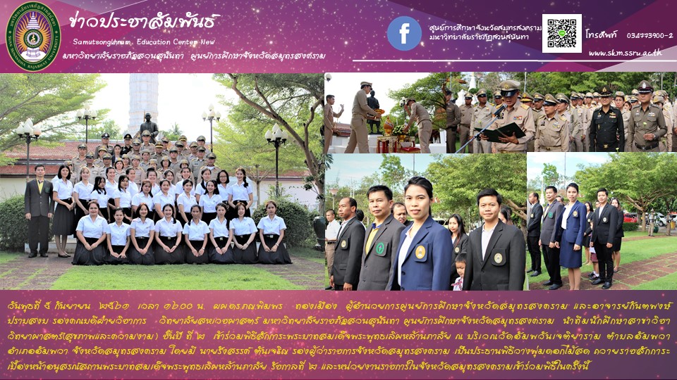 วันพุธที่ ๕ กันยายน ๒๕๖๑ เวลา ๑๖.๐๐ น. ผศ.ดร.ภญ.พิมพร ทองเมือง ผู้อำนวยการศูนย์การศึกษาจังหวัดสมุทรสงคราม และอาจารย์กันตพงษ์ ปราบสงบ รองคณบดีฝ่ายวิชาการ วิทยาลัยสหเวชศาสตร์ มหาวิทยาลัยราชภัฏสวนสุนันทา ศูนย์การศึกษาจังหวัดสมุทรสงคราม นำทีมนักศึกษาสาขาวิชาวิทยาศาสตร์(สุขภาพและความงาม) ชั้นปี ที่ ๒ เข้าร่วมพิธีสักการะพระบาทสมเด็จพระพุทธเลิศหล้านภาลัย ณ บริเวณวัดอัมพวันเจติยาราม ตำบลอัมพวา อำเภออัมพวา จังหวัดสมุทรสงคราม โดยมี นายรังสรรค์ ตันเจริญ รองผู้ว่าราชการจังหวัดสมุทรสงคราม เป็นประธานพิธีวางพุ่มดอกไม้สด ถวายราชสักการะเบื้องหน้าอนุสรณ์สถานพระบาทสมเด็จพระพุทธเลิศหล้านภาลัย รัชกาลที่ ๒ และหน่วยงานราชการในจังหวัดสมุทรสงครามเข้าร่วมพิธีในครั้งนี้