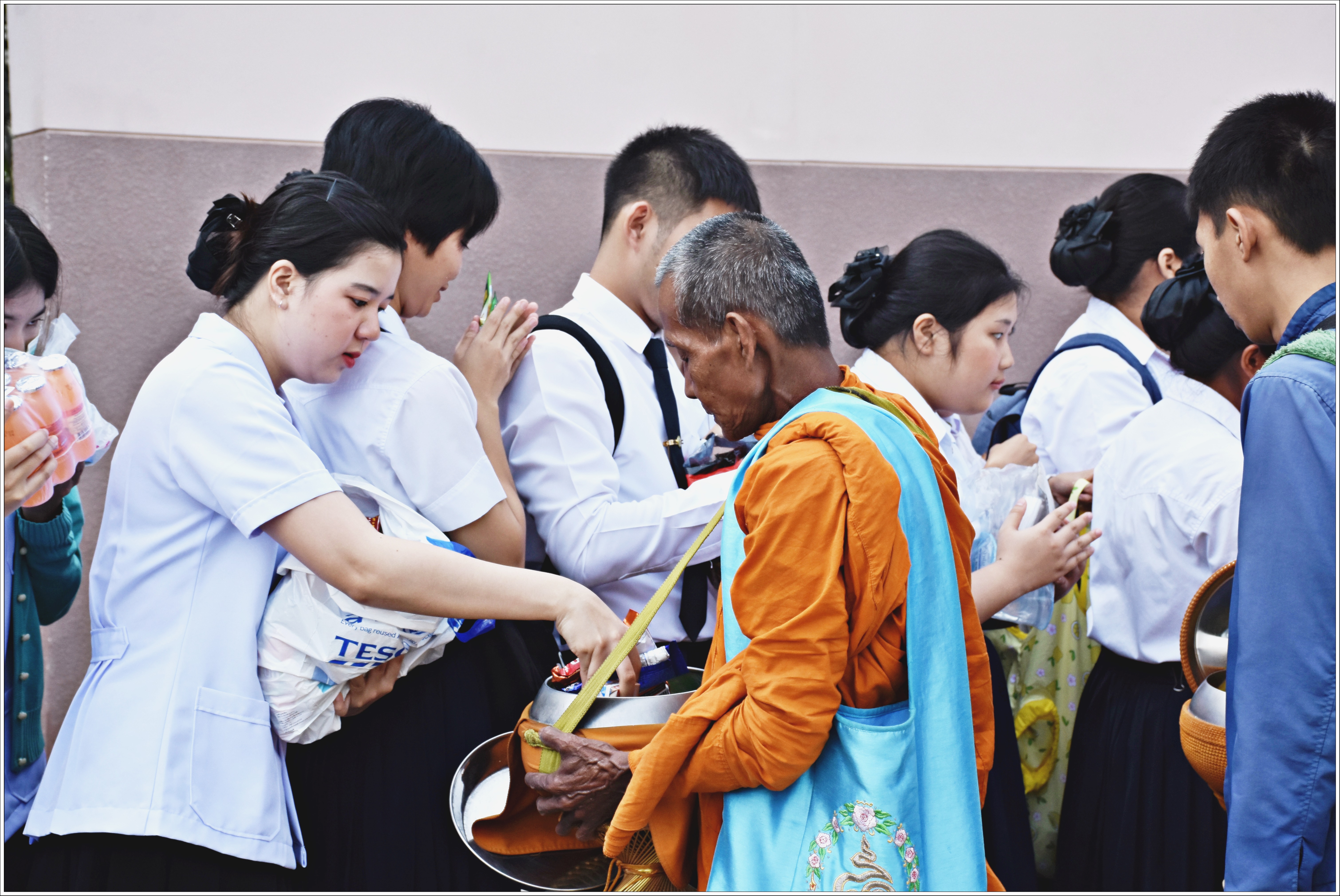 โดยพิธีดังกล่าวมีการจุดธูปเทียนบูชาพระรัตนตรัย ก่อนที่จะทำการตักบาตรข้าวสารอาหารแห้งแด่พระภิกษุ วัดบางแก้ว จังหวัดสมุทรสงคราม และถวายปัจจัยไทยธรรม จำนวน 9 รูป ซึ่งมีผู้บริหาร คณาจารย์ บุคลากร และนักศึกษา ร่วมทำบุญตักบาตร เป็นจำนวนมาก เพื่อเป็นสิริมงคลและขอให้พบเจอแต่สิ่งดีๆ ตลอดปีและตลอดไป