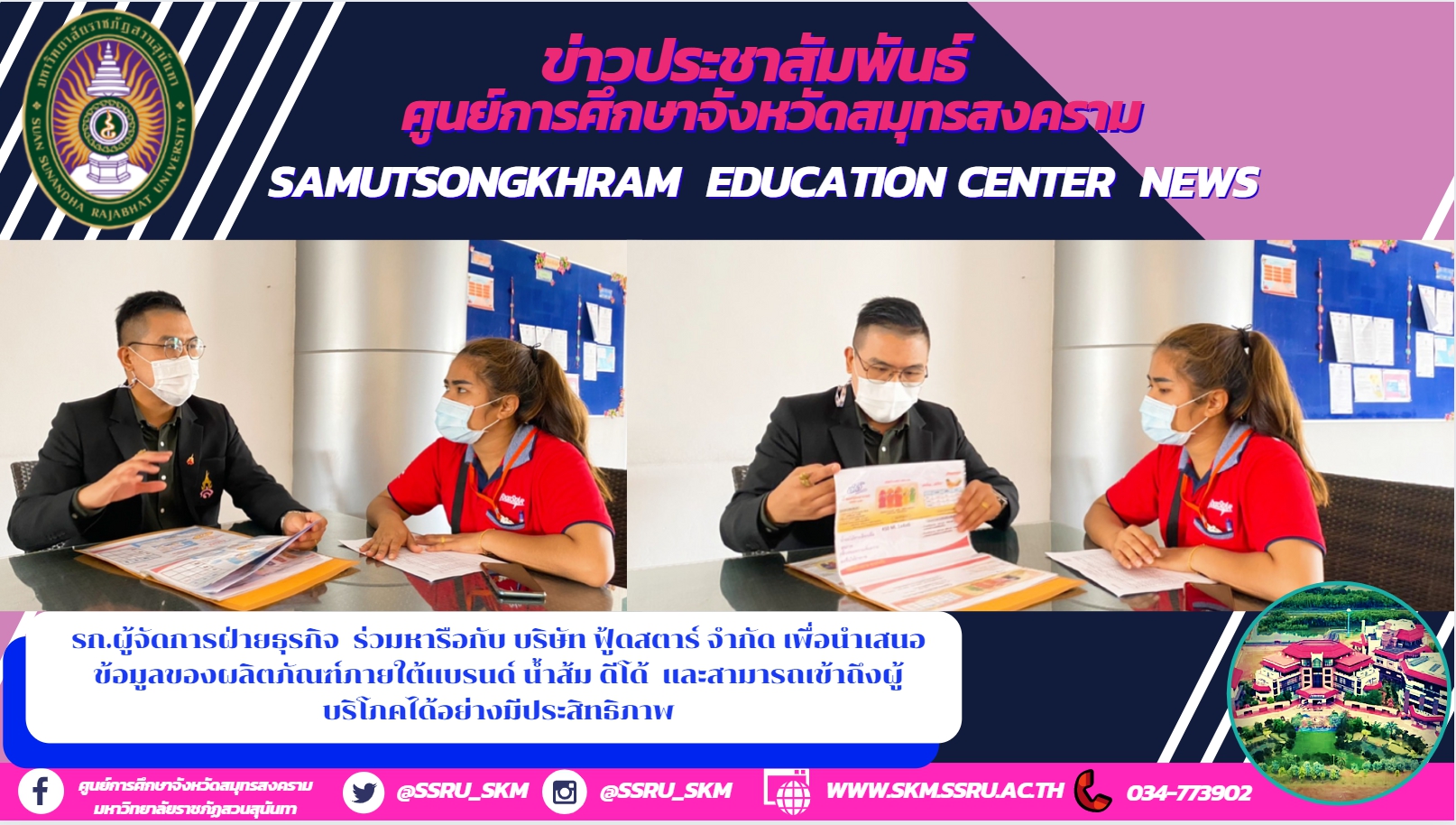 วันพุธที่ 10 กุมภาพันธ์ พ.ศ. 2564 เวลา 14.00 น.ณ บริเวณชั้น 1 อาคารปฏิบัติการฟื้นฟูสุขภาพ เจ้าหน้าที่ประสานงานขาย (Sales Support) บริษัท ฟู้ดสตาร์ จำกัด เข้าพบ นายจิรายุส พูลสวัสดิ์ รักษาการหัวหน้าฝ่ายธุรกิจ ศูนย์การศึกษาจังหวัดสมุทรสงคราม มหาวิทยาลัยราชภัฏสวนสุนันทา เพื่อนำเสนอข้อมูลของผลิตภัณฑ์ภายใต้แบรนด์ น้ำส้ม ดีโด้ เพื่อให้สามารถเข้าถึงผู้บริโภคได้อย่างมีประสิทธิภาพ และได้นำเสนอ ประโยชน์ คุณสมบัติเด่น ความสำคัญของสินค้าและบริการต่างๆ เพื่อสร้างแรงจูงใจและเป็นอีกหนึ่งช่องทางให้ผู้ประกอบการพิจารณาตัดสินใจที่จะรับผลิตภัณฑ์ดังกล่าวเพื่อมาจำหน่ายและต่อยอดธุรกิจจัดหารายได้ของศูนย์ฯ ต่อไป