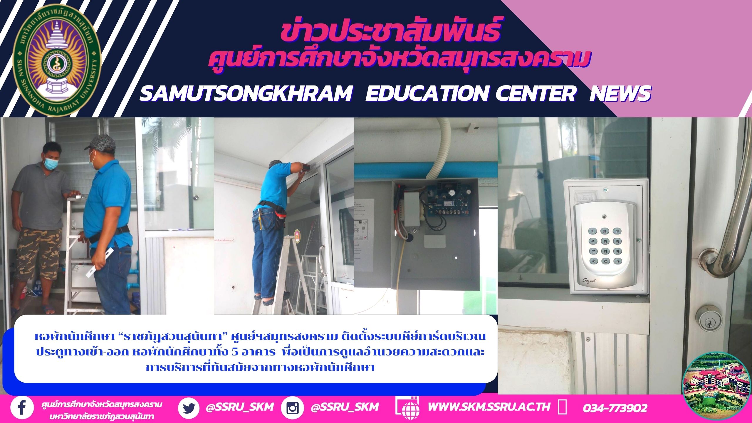 วันที่ 10 กุมภาพันธ์ 2564 ฝ่ายดูแลอาคารและสถานที่ประจำหอพักนักศึกษา ศูนย์การศึกษาจังหวัดสมุทรสงคราม มหาวิทยาลัยราชภัฏสวนสุนันทา โดย นายวัชระ พ่วงสำเภา ควบคุมงานติดตั้งระบบคีย์การ์ดบริเวณประตูทางเข้า-ออก หอพักนักศึกษาทั้ง 5 อาคาร โดยผู้ที่จะเข้าอาคารหอพักนักศึกษาทุกคน จะต้องมีคีย์การ์ดในการเปิดประตูอัตโนมัติเท่านั้นจึงจะเข้ามาภายในอาคารได้ ดังนั้นการติดตั้งระบบคีย์การ์ดบริเวณประตูทางเข้า-ออก จึงช่วยป้องกันผู้ที่จะเข้ามาในอาคารเพื่อหวังผลไม่ดีต่างๆได้ ทั้งนี้ เพื่อเป็นการดูแลอำนวยความสะดวกและการบริการที่ทันสมัยจากทางหอพักนักศึกษา ทั้งยังช่วยเพิ่มความปลอดภัยให้กับนักศึกษาและบุคลากร ที่พักอาศัยภายในหอพักนักศึกษาได้เป็นอย่างดี