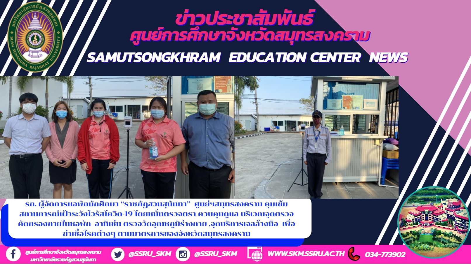 วันที่ 10 กุมภาพันธ์ 2564 เวลา 17.00 น.นางสาวภาวินี สักเล็บประดู่ รักษาการผู้จัดการหอพักนักศึกษา ศูนย์การศึกษาจังหวัดสมุทรสงคราม มหาวิทยาลัยราชภัฏสวนสุนันทา คุมเข้มสถานการณ์เฝ้าระวังไวรัสโควิด-19 โดยหมั่นตรวจตรา ควบคุมดูแล บริเวณจุดตรวจคัดกรองภายในหอพัก อาทิเช่น ตรวจวัดอุณหภูมิร่างกาย ,จุดบริการเจลล้างมือ เพื่อฆ่าเชื้อโรคต่างๆ ตามมาตรการของจังหวัดสมุทรสงคราม ในการควบคุมการแพร่ระบาดของโรคไวรัสโควิด -19 ตลอดจนประชาสัมพันธ์สร้างการรับรู้และแนวทางป้องกันการแพร่ระบาดของไวรัสฯ ให้กับนักศึกษา โดยมี วุฒิไกร ประวัติพงษ์,นายสถิระ นกอินทรีย์ อนุศาสก ประจำหอพักนักศึกษา ร่วมสร้างการรับรู้แก่นักศึกษาและดำเนินการตามมาตรการและแนวทางป้องกันกรณีการระบาดของเชื้อไวรัสโควิด 19 อย่างต่อเนื่อง