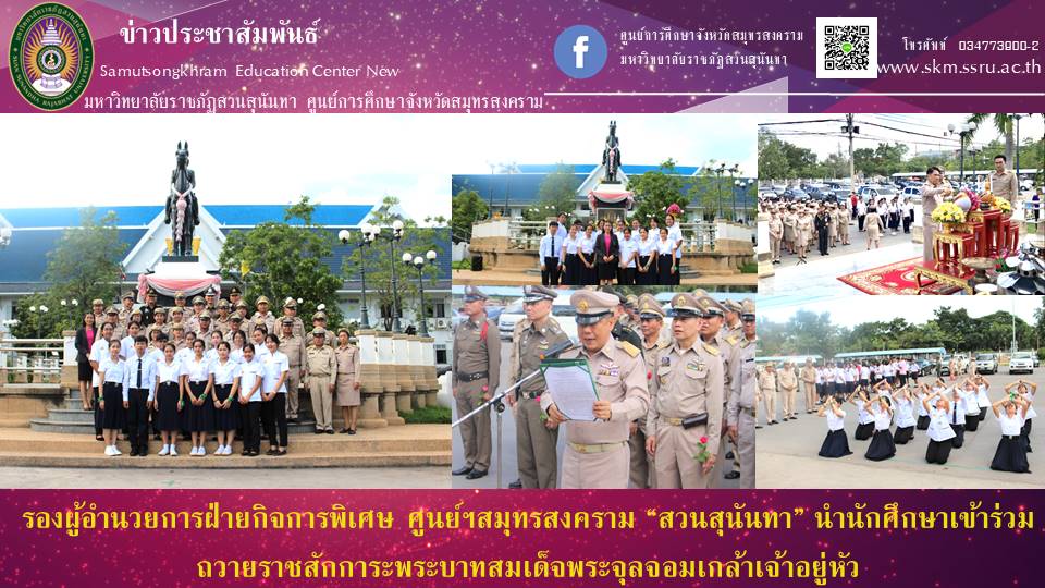 (11 ก.ย.61) เวลา 15.30 น. อาจารย์วรรณี พรมด้าว รองผู้อำนวยการฝ่ายกิจการพิเศษ ศูนย์การศึกษาจังหวัดสมุทรสงคราม มหาวิทยาลัยราชภัฏสวนสุนันทา นำนักศึกษาสาขาวิชาการแพทย์แผนไทยประยุกต์ วิทยาลัยสหเวชศาสตร์ เข้าร่วมพิธีถวายราชสักการะพระบาทสมเด็จพระจุลจอมเกล้าเจ้าอยู่หัว โดยมีนายคันฉัตร ตันเสถียร ผู้ว่าราชการจังหวัดสมุทรสงคราม เป็นประธานนำผู้บริหาร หัวหน้าส่วนราชการ ข้าราชการ ทหาร ตำรวจ คณะกรรมการเหล่ากาชาด และนักเรียนโรงเรียนถาวรานุกูล ประกอบพิธีถวายราชสักการะ ถวายบังคม วางพานพุ่มดอกไม้สด และกล่าวถวายราชสักการะพระบาทสมเด็จพระจุลจอมเกล้าเจ้าอยู่หัว เพื่อน้อมรำลึกถึงพระมหากรุณาธิคุณแห่งพระบาทสมเด็จพระจุลจอมเกล้าเจ้าอยู่หัว เพื่อแสดงความจงรักภักดีและน้อมรำลึกถึงพระมหากรุณาธิคุณของพระองค์ท่านที่มีต่อประเทศชาติ และปวงประชาชนชาวไทย ตลอดระยะเวลาที่ผ่านมา ณ บริเวณหน้าบรมราชานุสาวรีย์ พระบาทสมเด็จพระจุลจอมเกล้าเจ้าอยู่หัว หน้าศาลากลางจังหวัดสมุทรสงคราม