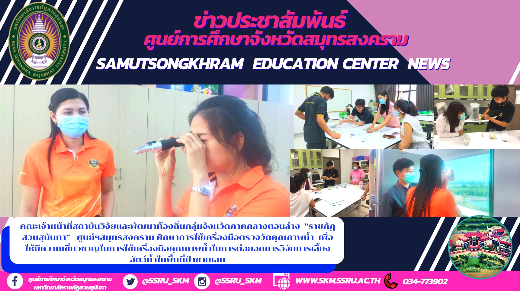 วันที่ 9 และวันที่ 11 กุมภาพันธ์ 2564 คณะเจ้าหน้าที่สถาบันวิจัยและพัฒนาท้องถิ่นกลุ่มจังหวัดภาคกลางตอนล่าง ศูนย์การศึกษาจังหวัดสมุทรสงคราม มหาวิทยาลัยราชภัฏสวนสุนันทา ศึกษาการใช้เครื่องมือตรวจวัดคุณภาพน้ำ โดย ดร.พงศ์มาดา ดามาพงษ์ หัวหน้าสาขาวิชาสาธารณสุขศาสตร์และการส่งเสริมสุขภาพ อาจารย์ธนวัฒน์ ชัยพงศ์พัชรา อาจารย์ประจำสาขาวิชาสาธารณสุขศาสตร์และการส่งเสริมสุขภาพ และนักวิจัย พร้อมด้วย นางสาวบุบผา ขุนบุญจันทร์  รักษาการหัวหน้าฝ่ายคลังและพัสดุ วิทยาลัยสหเวชศาสตร์ สนับสนุนการอำนวยความสะดวก ในการเรียนรู้การใช้เครื่องมือตรวจวัดคุณภาพน้ำ ให้มีความเชี่ยวชาญในการใช้เครื่องมือคุณภาพน้ำในการต่อยอดการวิจัยการเลี้ยงสัตว์น้ำในพื้นที่ป่าชายเลน ภายในศูนย์การศึกษาจังหวัดสมุทรสงคราม มหาวิทยาลัยราชภัฏสวนสุนันทา  โดยคำนึงถึงการรักษาสมดุลของธรรมชาติป่าชายเลนในพื้นที่อย่างยั่งยืน