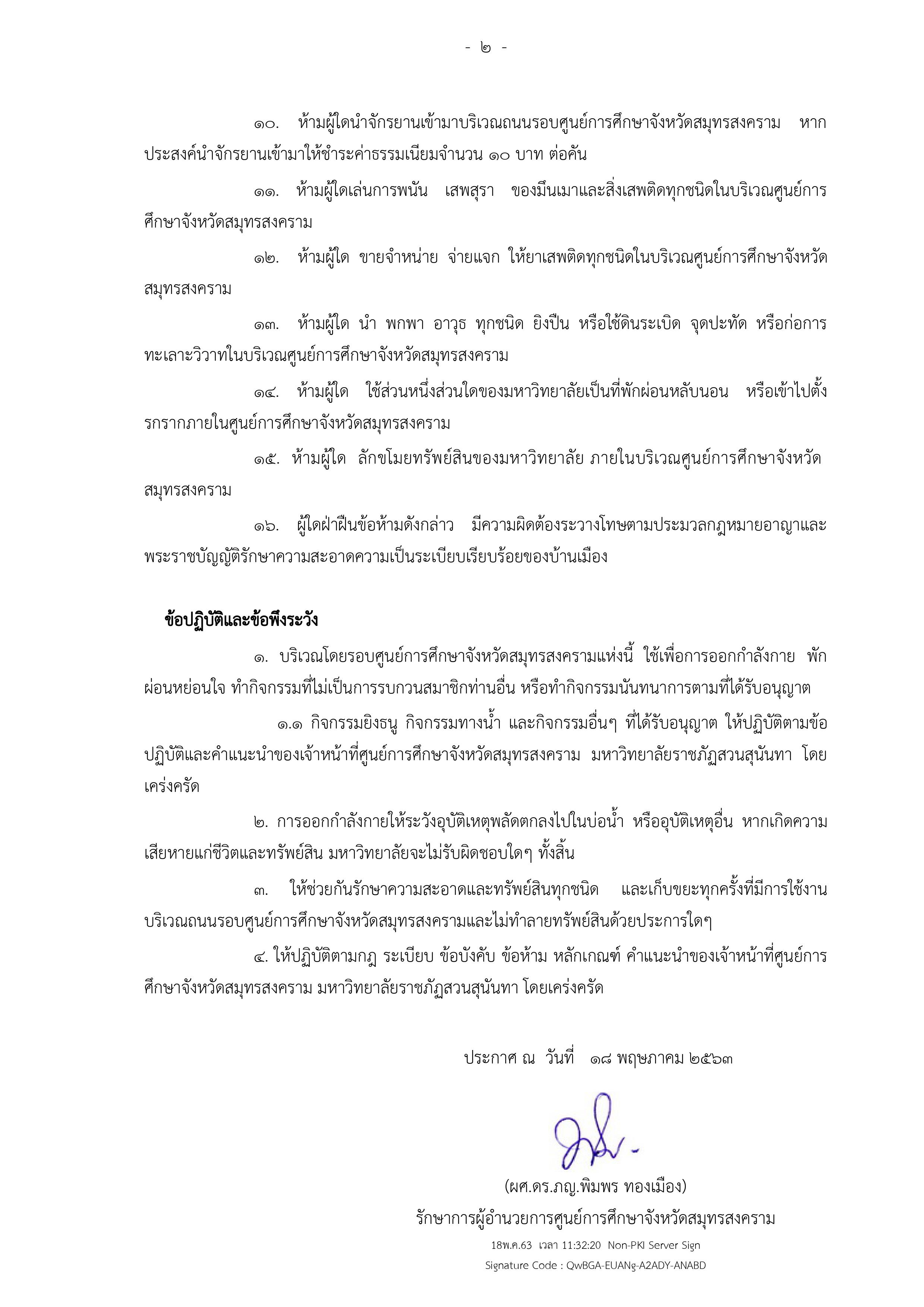 ประกาศศูนย์การศึกษาจังหวัดสมุทรสงคราม เรื่อง กำหนดเวลาเปิด - ปิดและข้อห้าม ข้อปฏิบัติสำหรับการใช้อาคาร สถานที่ และถนนรอบศูนย์การศึกษาจังหวัดสมุทรสงคราม มหาวิทยาลัยราชภัฏสวนสุนันทา