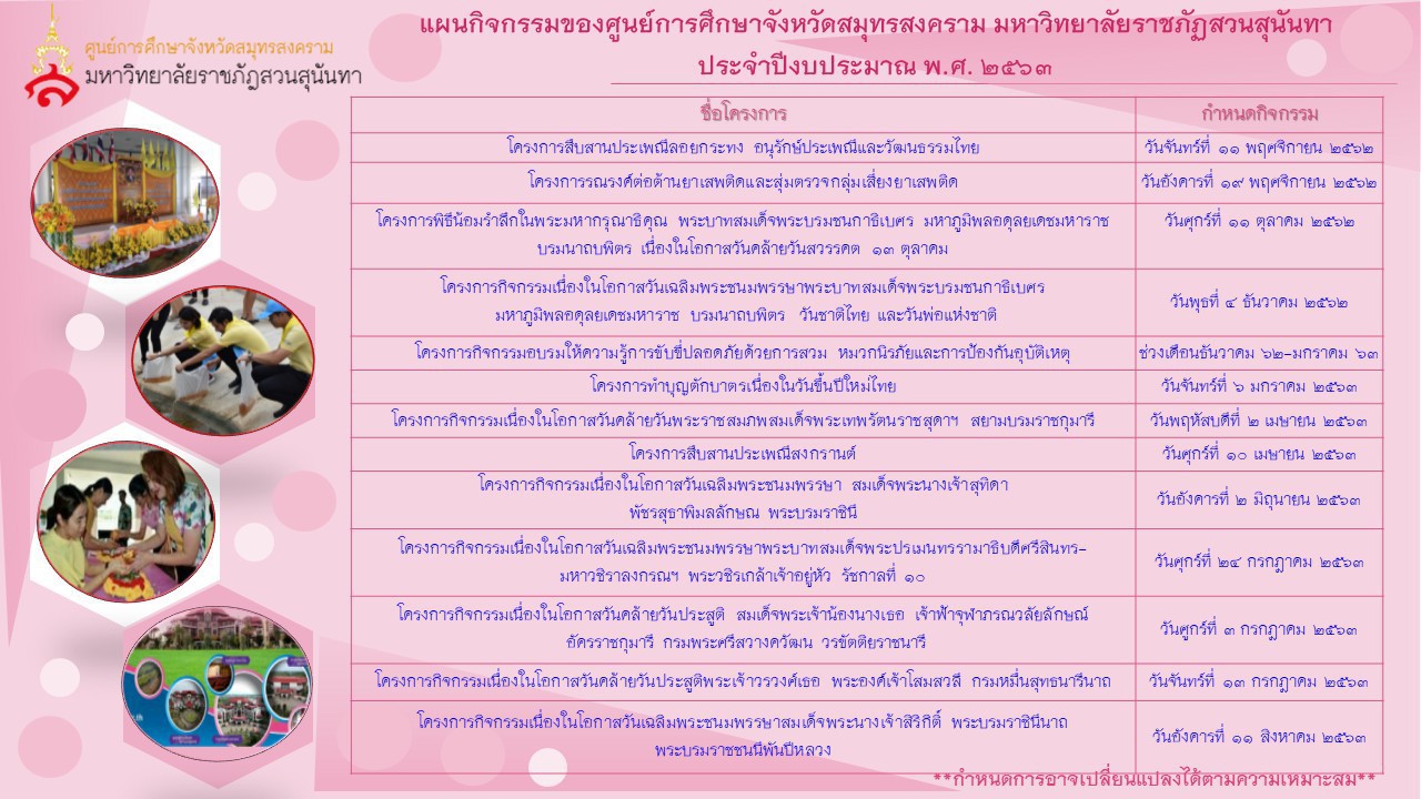 แผนกิจกรรมของศูนย์การศึกษาจังหวัดสมุทรสงคราม มหาวิทยาลัยราชภัฏสวนสุนันทา ประจำปีงบประมาณ พ.ศ. ๒๕๖๓