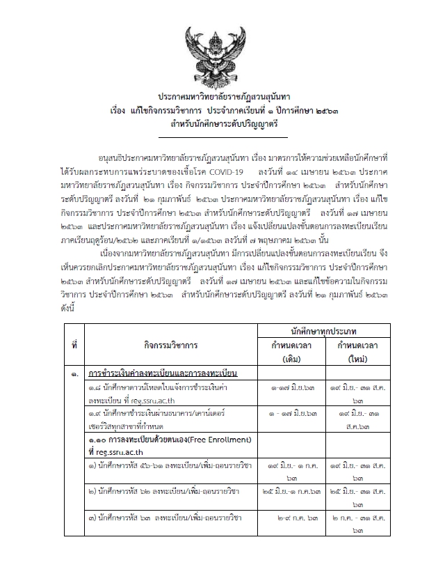 ประกาศมหาวิทยาลัยราชภัฏสวนสุนันทา เรื่อง แก้ไขกิจกรรมวิขาการ ประจำภาคเรียนที่ ๓ ปีการศึกษา ๒๕๖๓ สำหรับนักศึกษาระดับปริญญาตรี