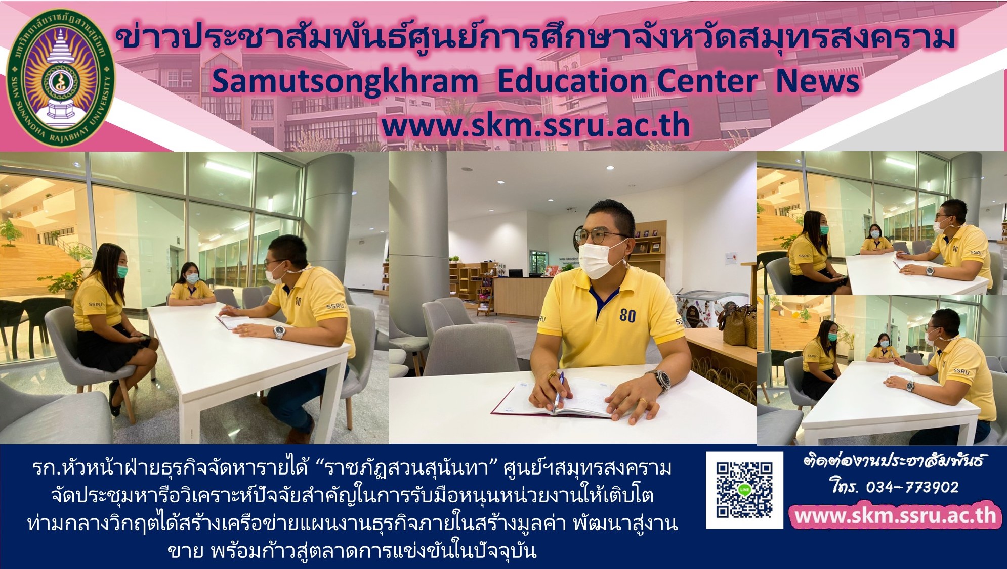 วันที่ 1 กุมภาพันธ์ 2564 เวลา 10.30 น. นายจิรายุส พูลสวัสดิ์ รักษาการหัวหน้าฝ่ายธุรกิจจัดหารายได้ มหาวิทยาลัยราชภัฏสวนสุนันทา จัดประชุมหารือสร้างเครือข่ายแผนงานธุรกิจภายในสร้างมูลค่า พัฒนาสู่งานขาย พร้อมก้าวสู่ตลาดการแข่งขันในปัจจุบัน โดยมุ่งเน้นมาตรการที่จะเพิ่มรายได้ โดยใช้วิกฤตถอดบทเรียนในช่วงการแพร่กระจายโรคติดเชื้อไวรัสโคโรนา 2019 (โควิด-19) วิเคราะห์ปัจจัยสำคัญในการรับมือหนุนหน่วยงานให้เติบโตท่ามกลางวิกฤตได้ ณ บริเวณชั้น 1 ห้อง Gallery อาคารปฏิบัติการฟื้นฟูสุขภาพ ศูนย์การศึกษาจังหวัดสมุทรสงคราม มหาวิทยาลัยราชภัฏสวนสุนันทา