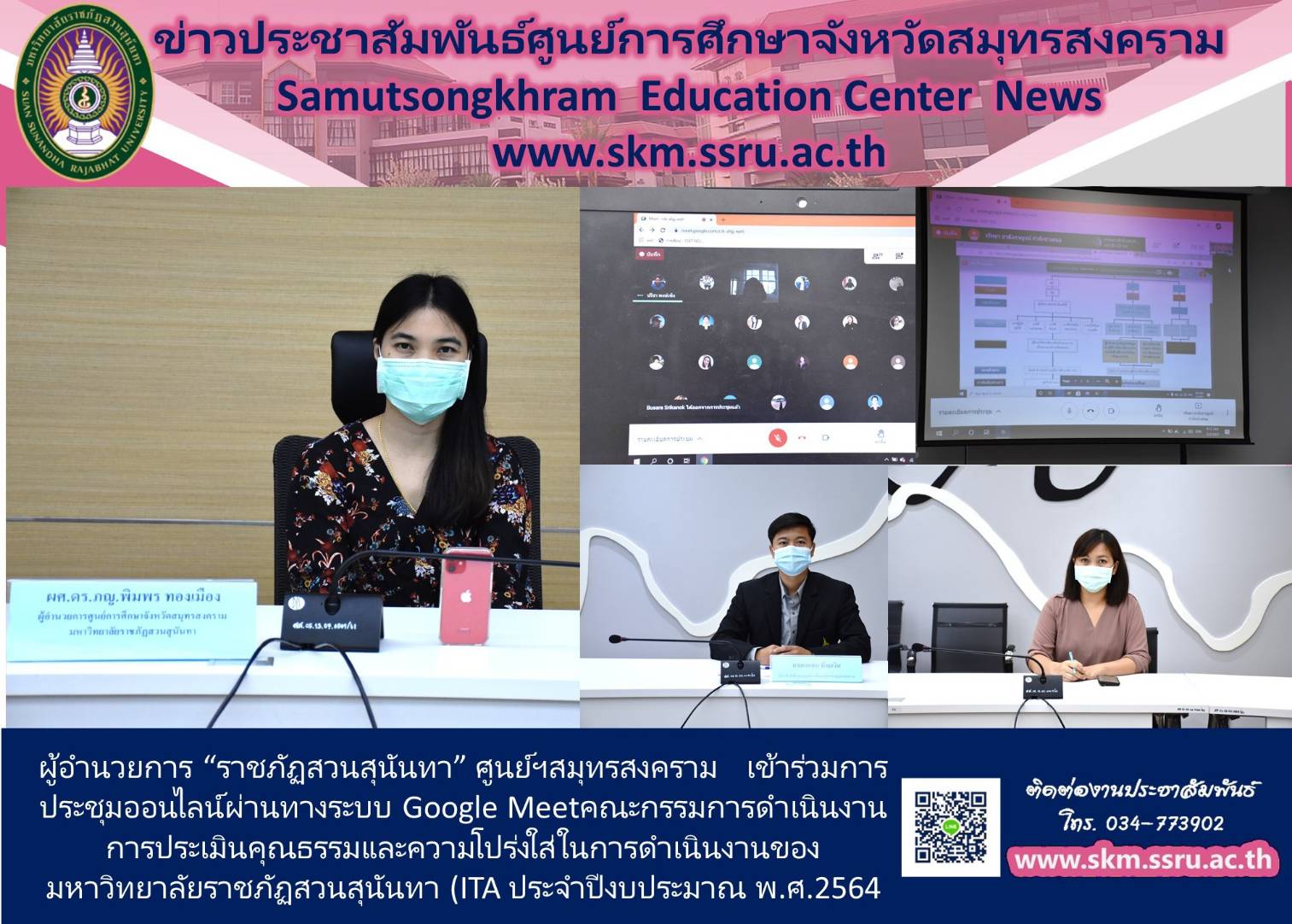 วันที่ 2 กุมภาพันธ์ 2564 ผู้ช่วยศาสตราจารย์ ดร.ภญ.พิมพร ทองเมือง ผู้อำนวยการศูนย์การศึกษาจังหวัดสมุทรสงคราม มหาวิทยาลัยราชภัฏสวนสุนันทา พร้อมด้วยนายเอกชน น้อยเงิน หัวหน้าสำนักงานฯ และนางสาวพัชรา แสงนวล นักวิเคราะห์แผนและนโยบาย เข้าร่วมการประชุมออนไลน์ผ่านทางระบบ Google Meetคณะกรรมการดำเนินงานการประเมินคุณธรรมและความโปร่งใส่ในการดำเนินงานของมหาวิทยาลัยราชภัฏสวนสุนันทา (ITA ประจำปีงบประมาณ พ.ศ.2564 โดยผู้ช่วยศาสตราจารย์ ดร. ปรีชา พงษ์เพ็ง รองอธิการบดีฝ่ายบริหาร เป็นประธานการประชุม ณ ห้องประชุมสภามหาวิทยาลัยราชภัฏสวนสุนันทา อาคาร 31 ชั้น 5