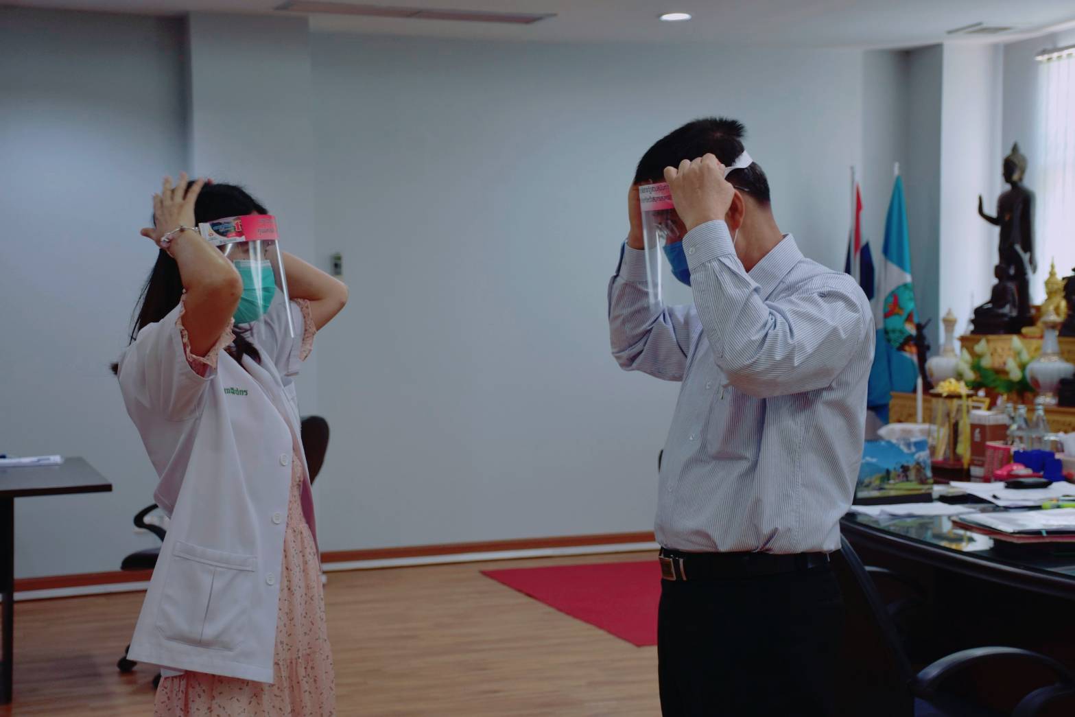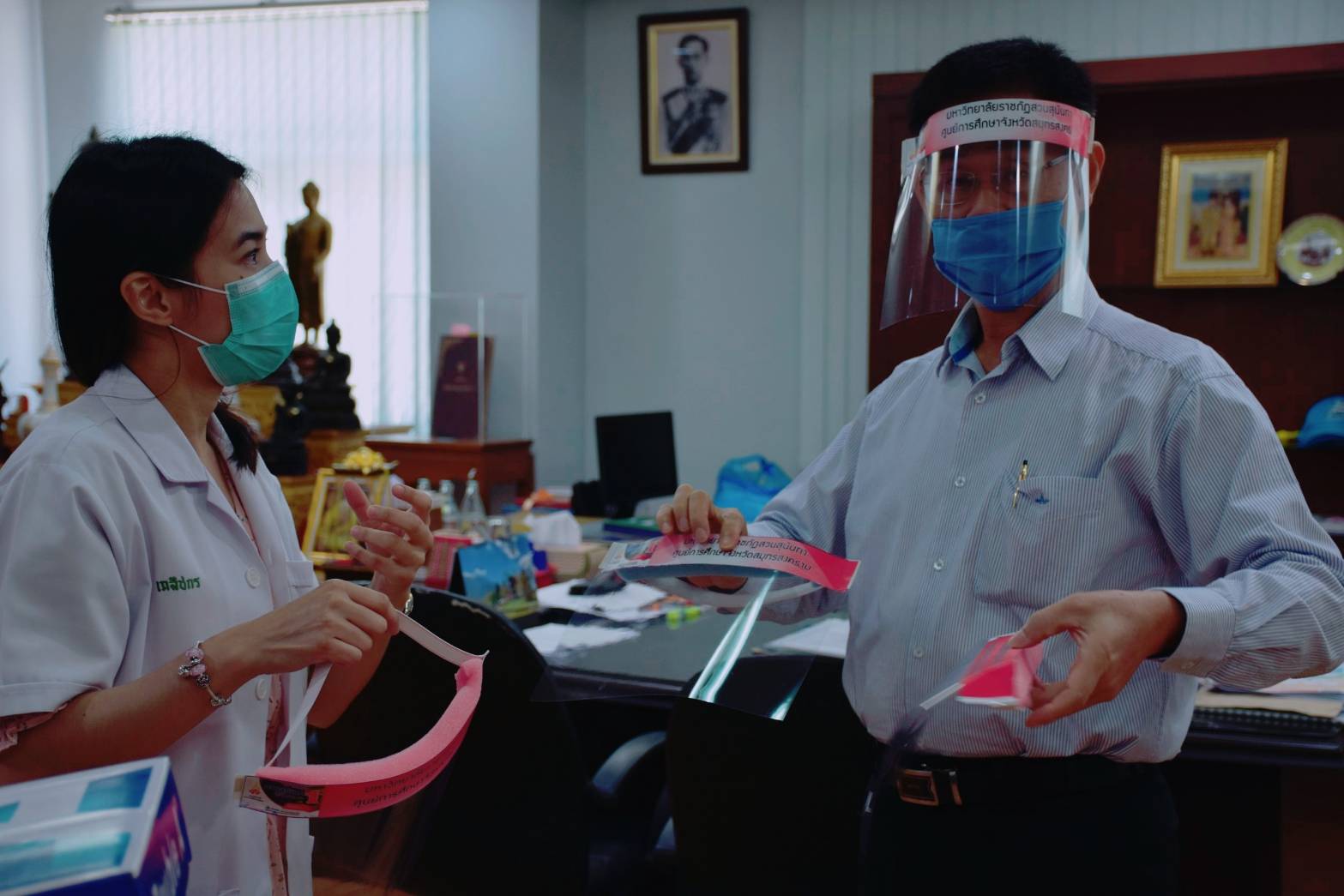 (27 มี.ค.63) เวลา 13.50 น. ผศ.ดร.ภญ.พิมพร ทองเมือง รักษาการผู้อำนวยการศูนย์การศึกษาจังหวัดสมุทรสงคราม มหาวิทยาลัยราชภัฏสวนสุนันทา พร้อมด้วยนายเอกชน น้อยเงิน หัวหน้าสำนักงานฯ และนางสาวอภิญญา มุกดาธนพงศ์ รักษาการผู้จัดการหอพักนักศึกษา เดินทางมอบหน้ากาก - FaceShieldDIY ให้แก่ผู้ว่าราชการจังหวัดสมุทรสงคราม จำนวน 30 ชิ้น เพื่อนำไปแจกจ่ายให้ หัวหน้าส่วนราชการที่รับหน้าที่ช่วยเหลือและป้องกันประชาชน