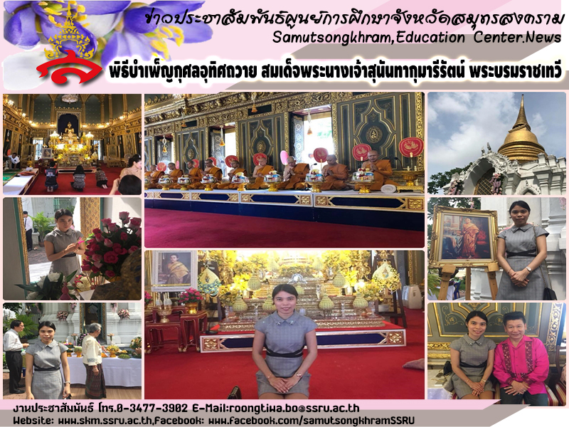 ผู้ช่วยศาสตราจารย์ ดร.ภญ.พิมพร ทองเมือง ผู้อำนวยการศูนย์การศึกษาจังหวัดสมุทรสงคราม มหาวิทยาลัยราชภัฏสวนสุนันทา เข้าร่วมพิธีบำเพ็ญกุศลอุทิศถวาย สมเด็จพระนางเจ้าสุนันทากุมารีรัตน์ พระบรมราชเทวี และสมเด็จพระเจ้าบรมวงศ์เธอ เจ้าฟ้ากรรณาภรณ์เพชรรัตน์โสภางคทัศนิยลักษณ์ อรรควรราชกุมารี เนื่องในวันคล้ายวันทิวงคต และวันสิ้นพระชนม์ครบรอบปีที่ ๑๓๗ ณ พระอุโบสถ และบริเวณพระสถูปสุนันทานุสาวรีย์ ภายในสุสานหลวง วัดราชบพิธสถิตมหาสีมาราม โดยมี รศ.ดร.ปรุงศักดิ์ อัตพุฒ รองอธิการบดีฝ่ายบริหาร เป็นประธาน