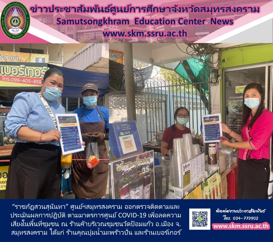 วันที่ 5 กุมภาพันธ์ 2564 ศูนย์การศึกษาจังหวัดสมุทรสงคราม มหาวิยาลัยราชภัฏสวนสุนันทา โดย ผู้ช่วยศาสตราจารย์ดร.ภญ.พิมพร ทองเมืองรักษาการผู้อำนวยการศูนย์ฯมอบหมายให้บุคลากร ออกตรวจประเมินสถานการณ์ตามมาตรการป้องกันโรคตามที่ทางราชการกำหนด เพื่อป้องกันการแพร่ระบาดของโรคโควิด-๑๙ โดยมีนางสาวศรัญญา หนูนาค และนางสาวนฤมล ดีชัยชนะ ได้ลงพื้นที่ ณ ร้านค้าบริเวณชุมชนวัดป้อมแก้ว อ.เมือง จ.สมุทรสงคราม ได้แก่ ร้านคุณบุ๋มน้ำมะพร้าวปั่น และร้านเบอร์เกอร์ ผลการตรวจติดตามพบว่า ร้านค้าที่ทำการตรวจประเมินทุกร้านมีการปฏิบัติตามมาตรการป้องกันโรคตามที่ทางราชการกำหนด เพื่อป้องกันการแพร่ระบาดของโรคโควิด-๑๙ ได้แก่ การทำความสะอาดร้านและพื้นผิวที่มีการสัมผัสบ่อย , มีจุดบริการเจลแอลกอฮอล์หรือน้ำยาฆ่าเชื้อโรค ,มีจุดบริการล้างมือ ,การสวมหน้ากากผ้า/หน้ากากอนามัยและไม่ให้บริการกับผู้ที่ไม่สวมหน้ากากอนามัย/หน้ากากผ้า , มีการเว้นระยะห่าง (Social Distancing) และได้ทำการประชาสัมพันธ์ตามมาตรการป้องกันโรคตามที่ทางราชการกำหนดเพื่อป้องกันการแพร่ระบาดของโรคโควิด-๑๙ ภายในครอบครัวและในที่ทำงานให้แก่ร้านค้าและผู้รับบริการโดยเคร่งครัด