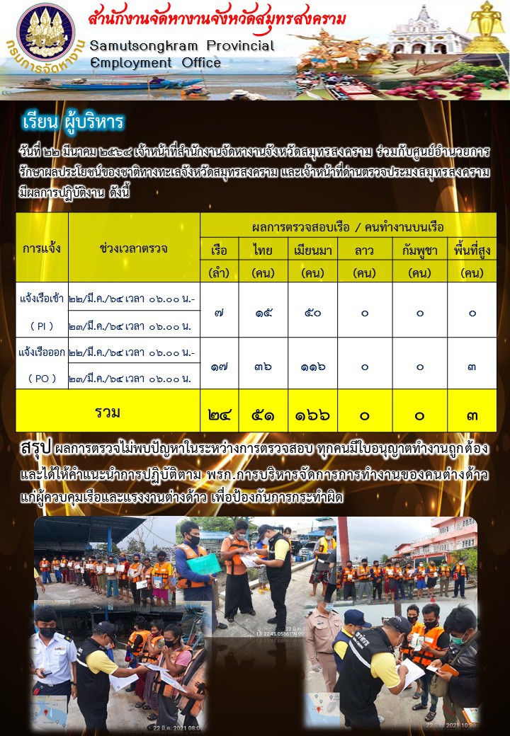 > สรุป ผลการตรวจไม่พบปัญหาในระหว่างการตรวจสอบ ทุกคนมีใบอนุญาตทำงานถูกต้อง และได้ให้คำแนะนำการปฏิบัติตาม พรก.การบริหารจัดการการทำงานของคนต่างด้าว แก่ผู้ควบคุมเรือและแรงงานต่างด้าว เพื่อป้องกันการกระทำผิด