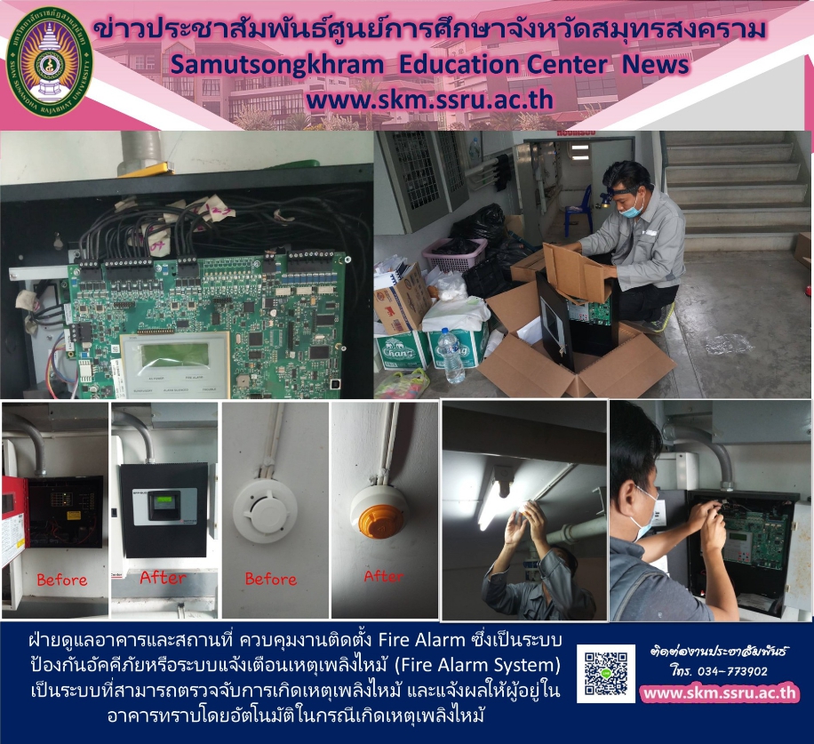 วันที่ 7 กุมภาพันธ์ 2564 ฝ่ายหอพักนักศึกษาโดย นายวัชระ พ่วงสำเภา บุคลากรฝ่ายดูแลอาคารและสถานที่ ควบคุมงานติดตั้ง Fire Alarm ซึ่งเป็นระบบป้องกันอัคคีภัยหรือระบบแจ้งเตือนเหตุเพลิงไหม้ (Fire Alarm System) เป็นระบบที่สามารถตรวจจับการเกิดเหตุเพลิงไหม้ และแจ้งผลให้ผู้อยู่ในอาคารทราบโดยอัตโนมัติในกรณีเกิดเหตุเพลิงไหม้ ซึ่งจะเป็นผลให้ลดความสูญเสียต่อชีวิตและทรัพย์สินของผู้ที่พักอาศัยในอาคารได้เป็นอย่างดี ทั้งนี้ เพื่อเป็นการเตรียมความพร้อมในการต้อนรับนักศึกษาและบุคลากรที่จะเข้ามาพักอาศัยภายในหอพักนักศึกษา ศูนย์การศึกษาจังหวัดสมุทรสงคราม มหาวิทยาลัยราชภัฏสวนสุนันทา ให้มีความปลอดภัยในทุกๆด้านและได้รับความสะดวกต่างๆที่ทางหอพักคอยดูแลและบริการตามความเหมาะสม มีความอุ่นใจเมื่อก้าวเข้ามาพักอาศัยในหอพักนักศึกษา ซึ่งเปรียบเหมือนบ้านหลังที่สองของนักศึกษา