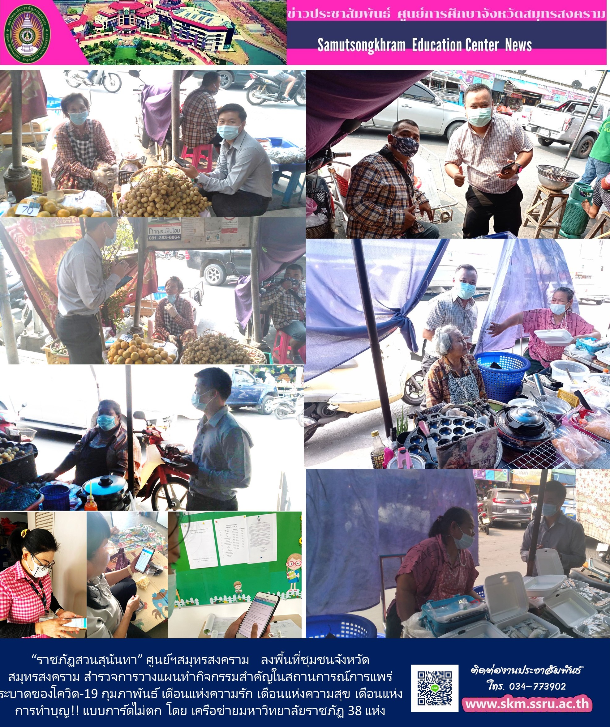 “ราชภัฏสวนสุนันทา” ศูนย์ฯสมุทรสงคราม ลงพื้นที่ชุมชนจังหวัดสมุทรสงคราม สำรวจการวางแผนทำกิจกรรมสำคัญในสถานการณ์การแพร่ระบาดของโควิด-19 กุมภาพันธ์ เดือนแห่งความรัก เดือนแห่งความสุข เดือนแห่งการทำบุญ!! แบบการ์ดไม่ตก โดย เครือข่ายมหาวิทยาลัยราชภัฏ 38 แห่ง