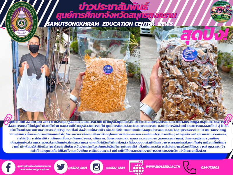 สุดปัง! วันที่ 22 เมษายน 2564 นายจิรายุส พูลสวัสดิ์ รักษาการหัวหน้าฝ่ายธุรกิจศูนย์การศึกษาจังหวัดสมุทรสงคราม มหาวิทยาลัยราชภัฏสวนสุนันทา บริการนำส่งอาหารทะเลให้แก่ลูกค้าถึงหน้าบ้าน นอกจากนี้ฝ่ายธุรกิจจัดหารายได้ ศูนย์การศึกษาจังหวัดสมุทรสงคราม ยังมีบริกา