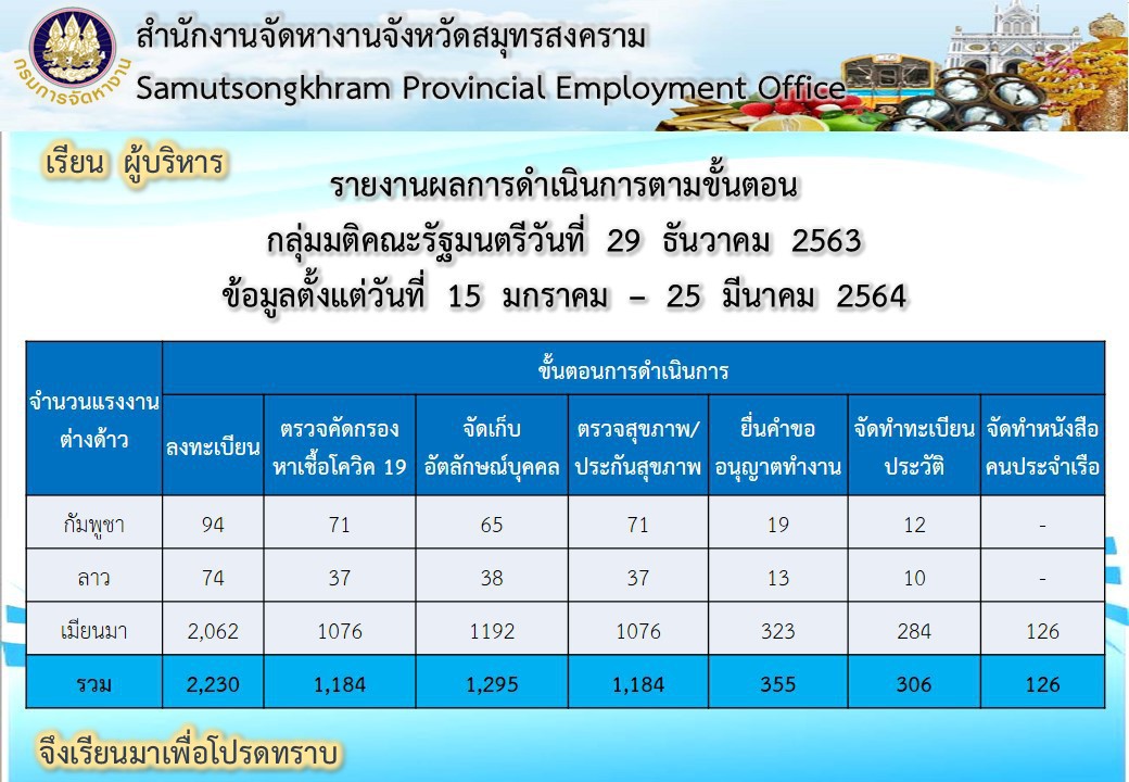 > รายงานผลการดำเนินการตามขั้นตอน กลุ่มมติคณะรัฐมนตรีวันที่ 29 ธันวาคม 2563 ข้อมูลตั้งแต่วันที่ 15 มกราคม - 25 มีนาคม 2564