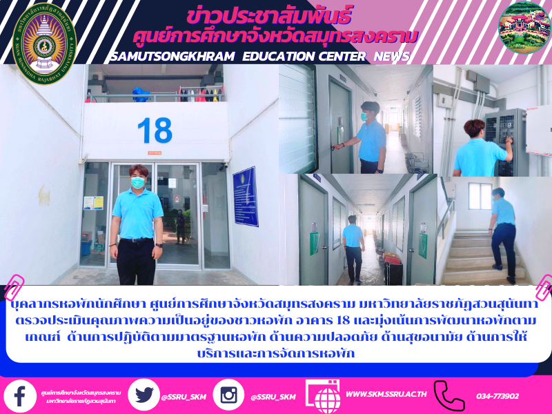 (9 เมษายน 64) เวลา 14.00 น. นายสถิระ นกอินทรีย์ เจ้าหน้าที่บริหารงานทั่วไป ศูนย์การศึกษาจังหวัดสมุทรสงคราม มหาวิทยาลัยราชภัฏสวนสุนันทา ได้รับมอบหมายจาก ผู้ช่วยศาสตร์จารย์ ดร.ภญ.พิมพร ทองเมือง ผู้อำนวยการฯ ตรวจประเมินคุณภาพความเป็นอยู่ของชาวหอพัก อาคาร 18 เเละมุ่งเน้นการพัฒนาหอพักตามเกณฑ์ ด้านการปฏิบัติตามมาตรฐานหอพัก ด้านความปลอดภัย ด้านสุขอนามัย ด้านการให้บริการและการจัดการหอพัก ณ หอพักนักศึกษาศูนย์การศึกษาจังหวัดสมุทรสงคราม