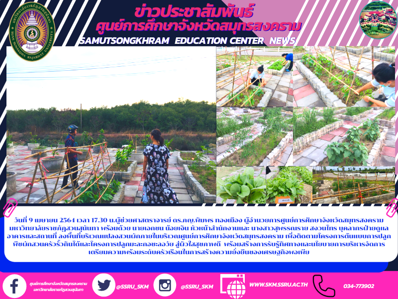 วันที่ 9 เมษายน 2564 เวลา 17.30 น.ผู้ช่วยศาสตราจารย์ ดร.ภญ.พิมพร ทองเมือง ผู้อำนวยการศูนย์การศึกษาจังหวัดสมุทรสงคราม มหาวิทยาลัยราชภัฏสวนสุนันทา พร้อมด้วย นายเอกชน น้อยเงิน หัวหน้าสำนักงานและ นางสาวสุพรรณราย สงวนไทร บุคลากรฝ่ายดูแลอาคารและสถานที่ ลงพื้นที่บริเวณแปลงสวนผักภายในบริเวณศูนย์การศึกษาจังหวัดสมุทรสงคราม เพื่อติดตามโครงการต้นแบบการปลูกพืชผักสวนครัวรั้วกินได้และโครงการปลูกมะละกอชะลอวัย สู่ผิวใสสุขภาพดี พร้อมสร้างการรับรู้ทิศทางและนโยบายการบริหารจัดการเตรียมความพร้อมระดับครัวเรือนในการสร้างความยั่งยืนของเศรษฐกิจพอเพียง