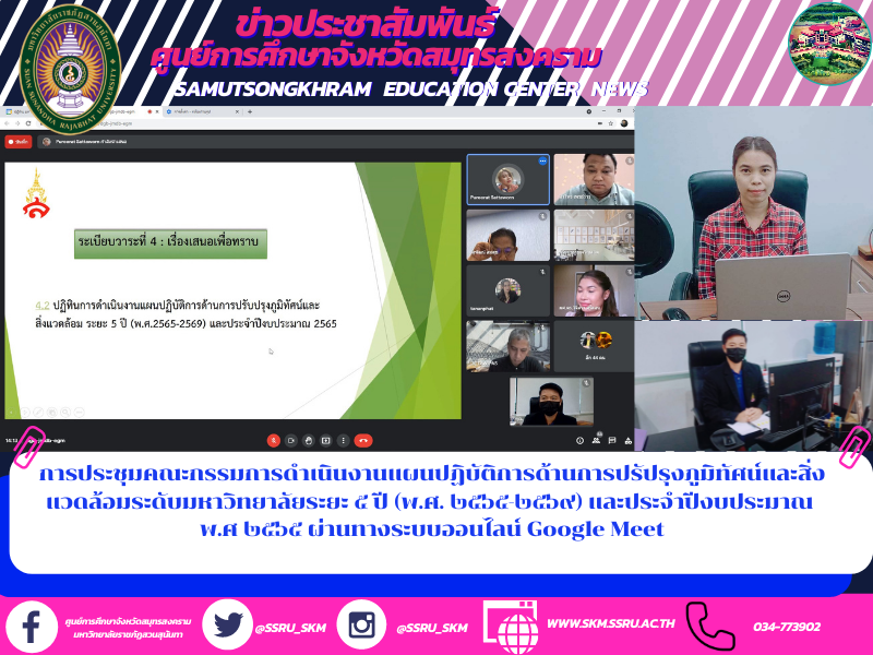 21 กันยายน 2564 เวลา 14.00 น. ผศ.ดร.ภญ.พิมพร ทองเมือง ผู้อำนวยการศูนย์การศึกษาจังหวัดสมุทรสงคราม มหาวิทยาลัยราชภัฏสวนสุนันทา พร้อมด้วยนายเอกชน น้อยเงิน หัวหน้าสำนักงาน เข้าร่วมการ การประชุมคณะกรรมการดำเนินงานแผนปฏิบัติการด้านการปรัปรุงภูมิทัศน์และสิ่งแวดล้อมระดับมหาวิทยาลัยระยะ ๕ ปี (พ.ศ. ๒๕๖๕-๒๕๖๙) และประจำปีงบประมาณ พ.ศ ๒๕๖๕ ผ่านทางระบบออนไลน์ Google Meet โดยมี ผศ.ดร.ปรีชา พงษ์เพ็ง รองอธิการบดีฝ่ายบริหาร มหาวิทยาลัยราชภัฏสวนสุนันทา เป็นประธานการประชุม ผ่านระบบออนไลน์ Google Meet