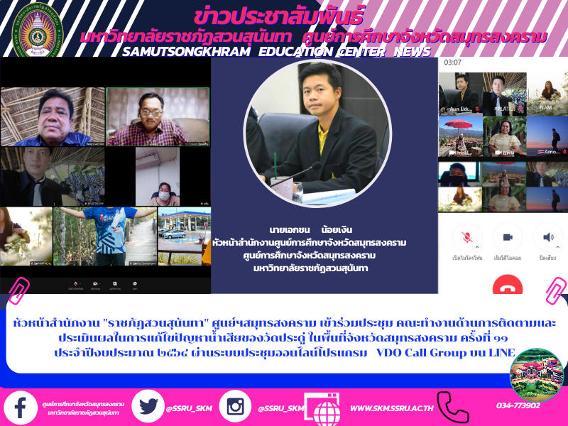 (22 ก.ย. 64) เวลา 13.30 น. นายเอกชน น้อยเงิน หัวหน้าสำนักงานศูนย์การศึกษาจังหวัดสมุทรสงคราม มหาวิทยาลัยราชภัฏสวนสุนันทา เข้าร่วมประชุมคณะทำงานด้านการติดตามและประเมินผลในการแก้ไขปัญหาน้ำเสียของวัดประดู่ในพื้นที่จังหวัดสมุทรสงคราม ครั้งที่ ๑๑ ประจำปีงบประมาณ ๒๕๖๔ ผ่านระบบประชุมออนไลน์โปรแกรม Googlemeet เพื่อให้การแก้ไขปัญหาความเดือดร้อนของประชาชนจากปัญหาดังกล่าว เป็นไปอย่างมีประสิทธิภาพสูงสุดโดยมีนางยุพิน ธรรมศิริ สถิติจังหวัดสมุทรสงคราม เป็นประธานในการประชุมคณะทำงานด้านการติดตามและประเมินผลในการแก้ไขปัญหาน้ำเสียคลองวัดประดู พร้อมติดตามความคืบหน้าผลการดำเนินงานของคณะกรรมการอำนวยการ,คณะทำงานด้านการติดตามและเฝ้าระวังน้ำเสีย,คณะทำงานการกำจัดตะกอนที่ตกค้างสะสมในคลอง,คณะทำงานด้านการจำกัดผักตบชวา,คณะทำงานด้านการตรวจสอบแหล่งน้ำเสีย,คณะทำงานด้านการประชาสัมพันธ์และคณะทำงานด้านติดตามและประเมินผล