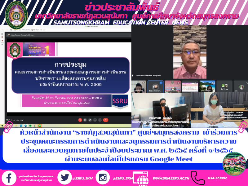 วันพฤหัสบดีที่ ๒๓ กันยายน ๒๕๖๔ เวลา ๐๙.๐๐ – ๑๒.๐๐ น. นายเอกชน น้อยเงิน หัวหน้าสำนักงานศูนย์การศึกษาจังหวัดสมุทรสงคราม มหาวิทยาลัยราชภัฏสวนสุนันทา พร้อมด้วยนางสาวพัชรา แสงนวล เจ้าหน้าที่บริหารงานทั่วไป เข้าร่วมการประชุมคณะกรรมการดำเนินงานและอนุกรรมการดำเนินงานบริหารความเสี่ยงและควบคุมภายในประจำปีงบประมาณ พ.ศ. ๒๕๖๕ ครั้งที่ ๑/๒๕๖๕ ผ่านระบบออนไลน์โปรแกรม Google Meet เพื่อรับทราบผลการดำเนินงานตามแผนบริหารความเสี่ยงและควบคุมภายใน พร้อมข้อเสนอแนะเพื่อการปรับปรุง ปฏิทินการดำเนินงานบริหารความเสี่ยงและควบคุมภายใน รวมทั้งแบบฟอร์มการควบคุมภายใน จากนั้นเป็นการพิจารณาความเสี่ยง และประเมินความเสี่ยง นำความเสี่ยงที่ได้มาบริหารจัดการต่อไป โดยมีรศ.ดร.วิทยา เมฆขำ รองอธิการบดีฝ่ายแผนงานและประกันคุณภาพ เป็นประธานการประชุมดังกล่าว