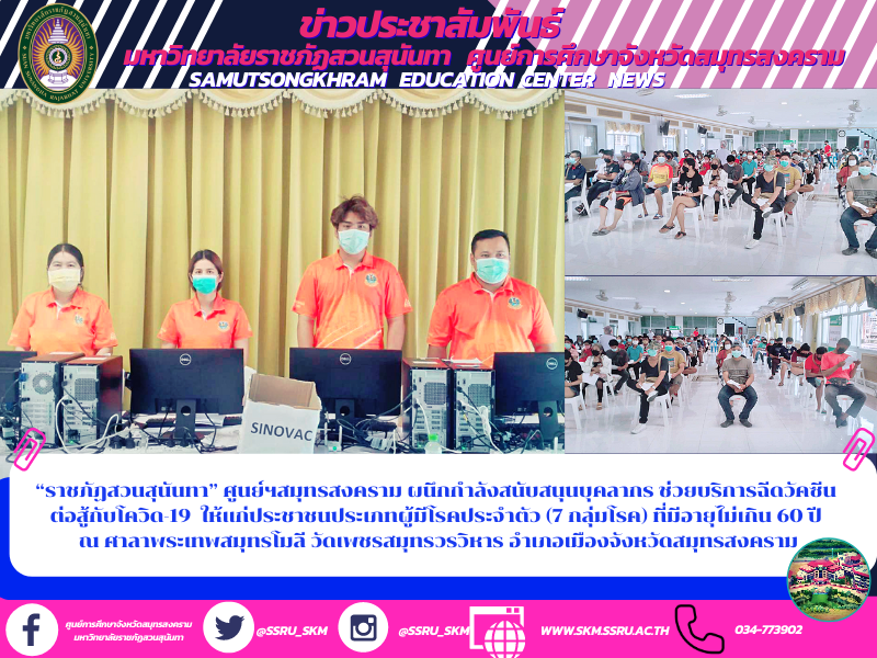 “ราชภัฏสวนสุนันทา” ศูนย์ฯสมุทรสงคราม ผนึกกำลังสนับสนุนบุคลากร ช่วยบริการฉีดวัคซีน ต่อสู้กับโควิด-19 ให้แก่ประชาชนประเภทผู้มีโรคประจำตัว (7 กลุ่มโรค) ที่มีอายุไม่เกิน 60 ปี ณ ศาลาพระเทพสมุทรโมลี วัดเพชรสมุทรวรวิหาร อำเภอเมืองจังหวัดสมุทรสงคราม