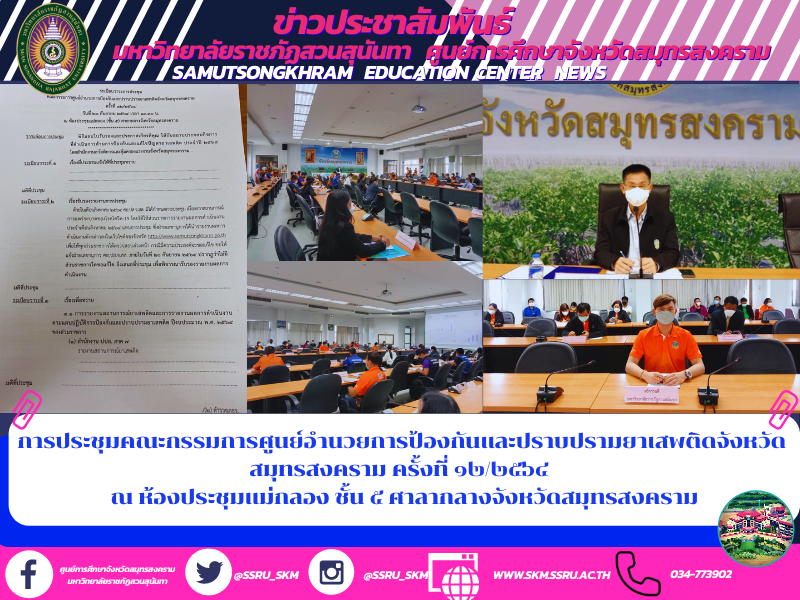 วันที่ ๒๓ กันยายน ๒๕๖๔ เวลา ๑๓.๓๐ น. ผู้ช่วยศาสตราจารย์ ดร.ภญ.พิมพร ทองเมือง ผู้อำนวยการศูนย์การศึกษาจังหวัดสมุทรสงคราม มหาวิทยาลัยราชภัฏสวนสุนันทา มอบหมายให้นายอริยเมศฐ์ ศิริฤกษ์รัตนา เจ้าหน้าที่บริหารงานทั่วไป เข้าร่วมการประชุมคณะกรรมการศูนย์อำนวยการป้องกันและปราบปรามยาเสพติดจังหวัดสมุทรสงคราม ครั้งที่ ๑๒/๒๕๖๔ ณ ห้องประชุมแม่กลอง ชั้น ๕ ศาลากลางจังหวัดสมุทรสงคราม โดยมี นายชรัส บุญณสะ ผู้ว่าราชการจังหวัดสมุทรสงคราม เป็นประธานการประชุม