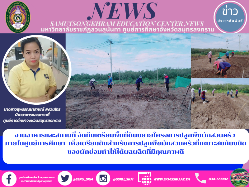 (12 ต.ค.64) เวลา 09.30 น.นางสาวสุพรรณนารายณ์ สงวนไทร ฝ่ายอาคารและสถานที่ ศูนย์การศึกษาจังหวัดสมุทรสงคราม มหาวิทยาลัยราชภัฏสวนสุนันทา จัดทีมเตรียมพื้นที่ดินขยายโครงการปลูกพืชผักสวนครัว ภายในศูนย์การศึกษา เพื่อเตรียมดินสำหรับการปลูกพืชผักสวนครัวที่เหมาะสมกับชนิดของผักย่อมทำให้ได้ผลผลิตที่มีคุณภาพดี ตามนโยบาย ผู้ช่วยศาสตร์จารย์ ดร.ภญ.พิมพร ทองเมือง ผู้อำนวยการศูนย์การศึกษาจังหวัดสมุทรสงคราม การเตรียมดินสำหรับการปลูกพืชผักสวนครัวที่เหมาะสมกับชนิดของผักย่อมทำให้ได้ผลผลิตที่มีคุณภาพดี
