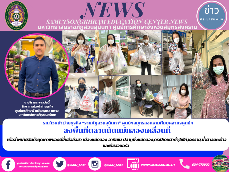 รก.หัวหน้าฝ่ายธุรกิจ “ราชภัฏสวนสุนันทา” ศูนย์ฯสมุทรสงครามทีมบุคลากรศูนย์ฯลงพื้นที่ตลาดนัดแม่กลองเคลื่อนที่ เพื่อจำหน่ายสินค้าคุณภาพของดีขึ้นชื่อลือชา เมืองแม่กลอง อาทิเช่น ปลาทูนึ่งแม่กลอง,กระปิเคยตาดำ,ไข่ไก่,ชะคราม,น้ำตาลมะพร้าว,คุกกี้ถั่วรูปปลาทู และสินค้าอื่นๆอีกหลายรายการรับออเดอร์ต่อเนื่อง บริการนำส่งความอร่อยทุกท่าน
