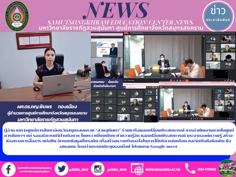 เช้าวันที่ 14 ตุลาคม พ.ศ.2564 เวลา 10.00-11.30 น. ผู้ช่วยศาสตราจารย์ ดร.ภญ.พิมพร ทองเมือง ผู้อำนวยการศูนย์การศึกษาจังหวัดสมุทรสงคราม มหาวิทยาลัยราชภัฏสวนสุนันทา พร้อมด้วยนายเอกชน น้อยเงิน หัวหน้าสำนักงานฯ ร่วมหารือแลกเปลี่ยนประสบการณ์ การดำเนินงานภายในศูนย์การศึกษาฯ แก่ รองอธิการบดีฝ่ายกิจการ ในคราวเพื่อเยี่ยมเยียน ทำความรู้จัก แลกเปลี่ยนประสบการณ์ กระจายองค์ความรู้ สร้างช่องทางการสื่อสาร แบ่งปัน อัพเดทข้อมูลที่ตรงกัน เพื่อสร้างความพึงพอใจในการให้บริการนักเรียน และรับฟังข้อคิดเห็น ข้อเสนอแนะ โดยผ่านระบบประชุมออนไลน์ โปรแกรม Google meet โดยมี ผู้ช่วยศาสตราจารย์ ดร.เจตน์สฤษฎิ์ อังศุกาญจนกุล รองอธิการบดีฝ่ายกิจการนักศึกษา คณบดี รองคณบดี หัวหน้าสาขาวิชา เจ้าหน้าที่กิจการนักศึกษา และตัวแทนสโมสรนักศึกษา ของศูนย์การศึกษาจังหวัดสมุทรสงคราม มหาวิทยาลัยราชภัฏสวนสุนันทา ในโครงการ ”รองอธิการบดีฝ่ายกิจการนักศึกษาสัญจร“