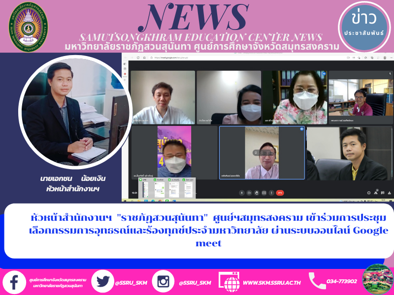 (19 ต.ค. 64) เวลา 10.00 น. นายเอกชน น้อยเงิน หัวหน้าสำนักงานศูนย์การศึกษาจังหวัดสมุทรสงคราม มหาวิทยาลัยราชภัฏสวนสุนันทา เข้าร่วมการประชุมเลือกกรรมการอุทธรณ์และร้องทุกข์ประจำมหาวิทยาลัย ผ่านระบบออนไลน์ Google meet
