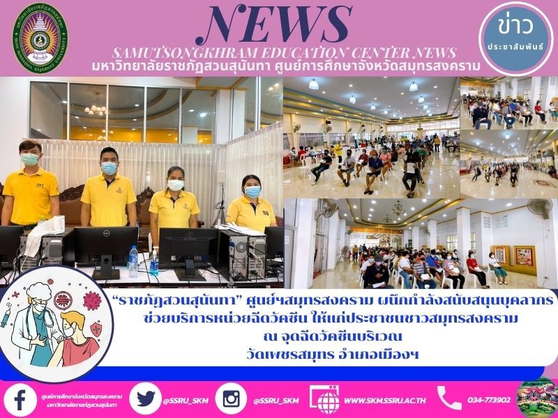 “ราชภัฏสวนสุนันทา” ศูนย์ฯสมุทรสงคราม ผนึกกำลังสนับสนุนบุคลากร ช่วยบริการหน่วยฉีดวัคซีน ให้แก่ประชาชนชาวสมุทรสงคราม ณ จุดฉีดวัคซีนบริเวณ วัดเพชรสมุทร อำเภอเมืองฯ