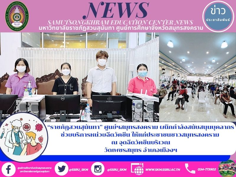 ที่ผ่านมาจนถึงตอนนี้ ศูนย์การศึกษาจังหวัดสมุทรสงคราม มหาวิทยาลัยราชภัฏสวนสุนันทา โดย ผศ.ดร.ภญ.พิมพร ทองเมือง ผู้อำนวยการฯ จึงมอบหมายให้บุคลากรสังกัดศูนย์การศึกษาจังหวัดสมุทรสงคราม ช่วยบริการหน่วยฉีดวัคซีน ให้แก่ประชาชนชาวสมุทรสงคราม ณ จุดฉีดวัคซีนบริเวณวัดเพชรสมุทร อำเภอเมืองฯ