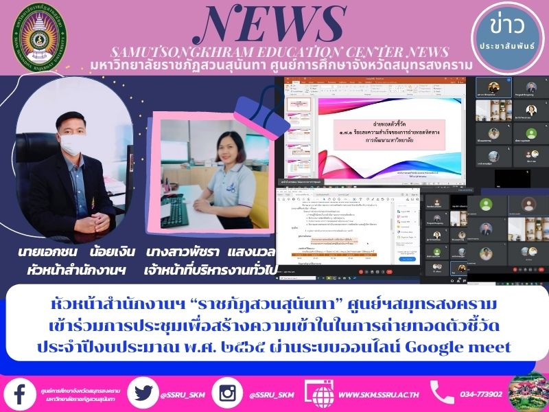 (26 ต.ค.64) เวลา 13.00 น. นายเอกชน น้อยเงิน หัวหน้าสำนักงานศูนย์การศึกษาจังหวัดสมุทรสงคราม มหาวิทยาลัยราชภัฏสวนสุนันทา พร้อมด้วยนางสาวพัชรา แสงนวล เจ้าหน้าที่บริหารงานทั่วไป เข้าร่วมการประชุมเพื่อสร้างความเข้าในในการถ่ายทอดตัวชี้วัด ประจำปีงบประมาณ พ.ศ. ๒๕๖๕ ผ่านระบบออนไลน์ Google meet ซึ่งการประชุมจัดขึ้นโดย สำนักงานอธิการบดี เพื่อสร้างความเข้าใจการถ่ายทอดตัวชี้วัดของกองกลาง โดยมีวัตถุประสงค์ของการประชุมเพื่อสื่อสารแนวทางการขับเคลื่อนตัวชี้วัดและประเมินผลการปฏิบัติราชการ ให้กับเจ้าหน้าที่ที่รับผิดชอบ ก.พ.ร. ของหน่วยงานสู่การนำไปปฏิบัติและรายงานผลการปฏิบัติราชการให้เป็นไปในทิศทางเดียวกัน