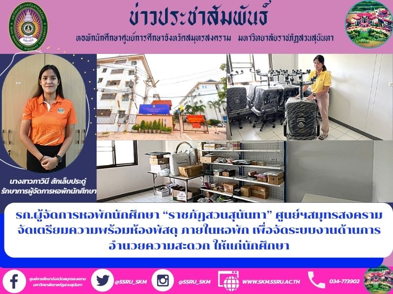 (27 ต.ค. 64) เวลา 11.00 น. นางสาวภาวินี สักเล็บประดู่ รักษาการผู้จัดการหอพักนักศึกษา ศูนย์การศึกษาจังหวัดสมุทรสงคราม มหาวิทยาลัยราชภัฏสวนสุนันทา พร้อมด้วยบุคคลาการ จัดเตรียมความพร้อมห้องพัสดุ ภายในหอพัก เพื่อจัดระบบงานด้านการอำนวยความสะดวก ให้แก่นักศึกษา