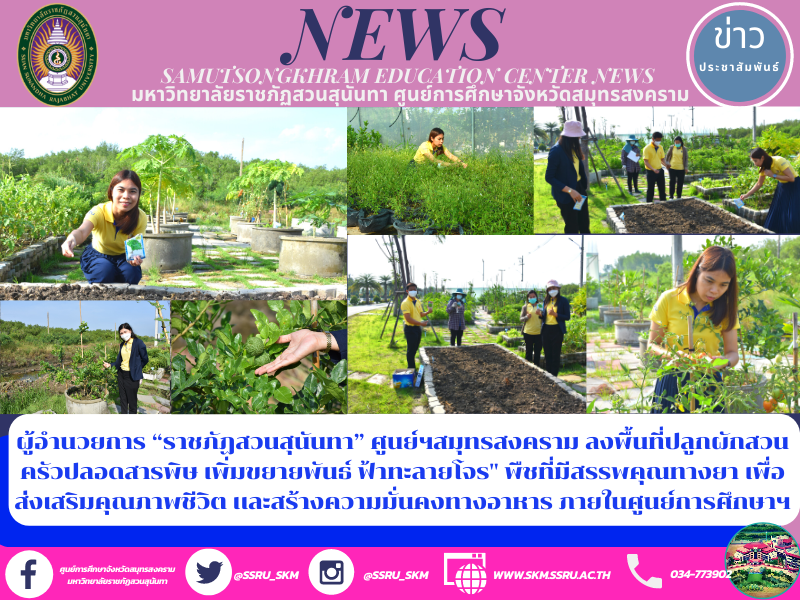 (8 พฤศจิกายน 2564) เวลา 09.00 น. ผู้ช่วยศาสตร์จารย์ ดร.ภญ.พิมพร ทองเมือง ผู้อำนวยการศูนย์การศึกษาจังหวัดสมุทรสงคราม มหาวิทยาลัยราชภัฏสวนสุนันทา พร้อมด้วยนายเอกชน น้อยเงิน หัวหน้าสำนักงานฯ เเละบุคลากร ลงพื้นที่ปลูกผักสวนครัวปลอดสารพิษ เพิ่มขยายพันธ์ ฟ้าทะลายโจร" พืชที่มีสรรพคุณทางยา เพื่อส่งเสริมคุณภาพชีวิต เเละสร้างความมั่นคงทางอาหาร ภายในศูนย์การศึกษาฯ ด้วยผักชีพุงสูงถึง 400 บาทต่อกิโล ผู้อำนวยการฯ จึงมีนโยบายลดต้นทุน พร้อมเพิ่มคุณภาพชีวิตให้แก่บุคลากรจึง ปลูกผักชี เพื่อไว้รับประทานต่อไป