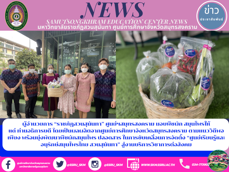 (10 พ.ย. 64) เวลา 10.00 น. ผู้ช่วยศาสตร์จารย์ ดร.ภญ.พิมพร ทองเมือง ผู้อำนวยการศูนย์การศึกษาจังหวัดสมุทรสงคราม มหาวิทยาลัยราชภัฏสวนสุนันทา พร้อมด้วยนายเอกชน น้อยเงิน หัวหน้าสำนักงาน และบุคลากรเข้ามอบ มอบพืชผัก สมุนไพรให้แด่ รองศาสตราจารย์ ดร.ชุติกาญจน์ ศรีวิบูลย์ อธิการบดีมหาวิทยาลัยราชภัฏสวนสุนันทา โดยเป็นผลผลิตจากศูนย์การศึกษาจังหวัดสมุทรสงคราม ตามแนววิถีพอเพียง ซึ่งผักที่นำมาได้แก่พริกมะนาวตะไคร้ใบมะกรูดซึ่งเป็นเครื่องต้มยำสมุนไพรทานแล้วจะได้ประโยชน์และมีสรรพคุณในการช่วยขับลม บำรุงร่างกาย นอกจากนี้ ยังได้คัดสรรนำเอาผัดผักจากแหล่งเรียนรู้เศรษฐกิจพอเพียงสวนสุนันทาการปลูกพืชและผักสมุนไพรไทย อาทิเช่น คะน้า วอเตอร์เกรส และมะเขือเทศ สดๆจากสวนศูนย์การศึกษาจังหวัดสมุทรสงครามมหาวิทยาลัยราชภัฎสวนสุนันทาอีกด้วย พร้อมมุ่งพัฒนาพืชผักสมุนไพร ปลอดสาร ในการขับเคลื่อนการจัดตั้ง “ศูนย์เรียนรู้และอนุรักษ์สมุนไพรไทย สวนสุนันทา” สู่งานบริการวิชาการต่อสังคมต่อไป