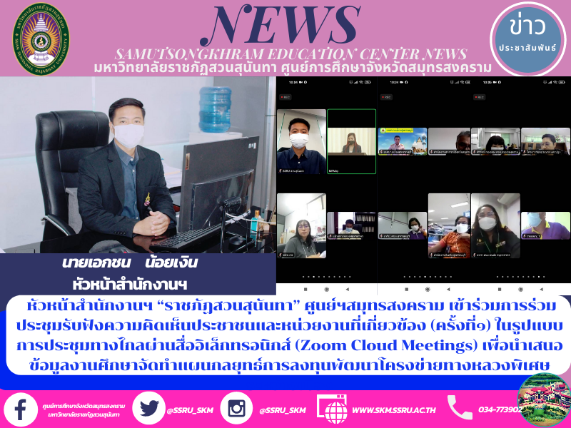 ในวันพฤหัสบดี ที่ ๑๑ พฤศจิกายน ๒๕๖๔ เวลา 09.00 น. ผู้ช่วยศาสตราจารย์ ดร.ภญ.พิมพร ทองเมือง ผู้อำนวยการศูนย์การศึกษาจังหวัดสมุทรสงคราม มหาวิทยาลัยราชภัฏสวนสุนันทา มอบหมายให้นายเอกชน น้อยเงิน หัวหน้าสำนักงานฯ เข้าร่วมการร่วมประชุมรับฟังความคิดเห็นประชาชนและหน่วยงานที่เกี่ยวข้อง (ครั้งที่๑) ในรูปแบบการประชุมทางไกลผ่านสื่ออิเล็กทรอนิกส์ (Zoom Cloud Meetings) เพื่อนำเสนอข้อมูลงานศึกษาจัดทำแผนกลยุทธ์การลงทุนพัฒนาโครงข่ายทางหลวงพิเศษระหว่างเมือง