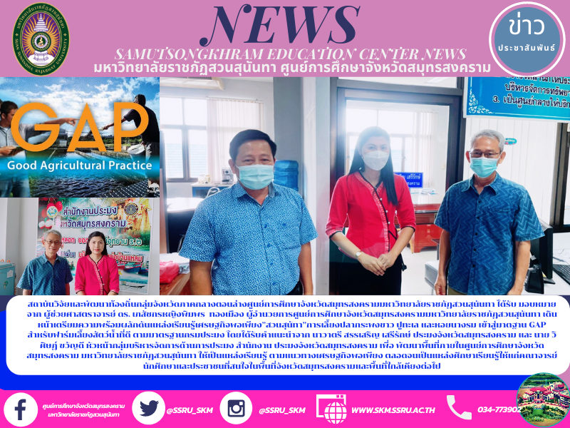 สถาบันวิจัยและพัฒนาท้องถิ่นกลุ่มจังหวัดภาคกลางตอนล่างศูนย์การศึกษาจังหวัดสมุทรสงครามมหาวิทยาลัยราชภัฎสวนสุนันทา ได้รับ มอบหมายจาก ผู้ช่วยศาสตราจารย์ ดร. เภสัชกรหญิงพิมพร ทองเมือง ผู้อำนวยการศูนย์การศึกษาจังหวัดสมุทรสงครามมหาวิทยาลัยราชภัฎสวนสุนันทา เดินหน้าเตรียมความพร้อมผลักดันแหล่งเรียนรู้เศรษฐกิจพอเพียง”สวนสุนัทา”การเลี้ยงปลากระพงขาว ปูทะเล และหอยนางรม เข้าสู่มาตฐาน GAP สำหรับฟาร์มเลี้ยงสัตว์น้ำที่ดี ตามมาตรฐานกรมประมง โดยได้รับคำแนะนำจาก นาวาตรี สรรเสริญ เสรีรักษ์ ประมงจังหวัดสมุทรสงคราม และ นาย วิศิษฎ์ ขวัญดี หัวหน้ากลุ่มบริหารจัดการด้านการประมง สำนักงาน ประมงจังหวัดสมุทรสงคราม เพื่อ พัฒนาพื้นที่ภายในศูนย์การศึกษาจังหวัดสมุทรสงคราม มหาวิทยาลัยราชภัฎสวนสุนันทา ให้เป็นแหล่งเรียนรู้ ตามแนวทางเศรษฐกิจพอเพียง ตลอดจนเป็นแหล่งศึกษาเรียนรู้ให้แก่คณาจารย์นักศึกษาและประชาชนที่สนใจในพื้นที่จังหวัดสมุทรสงครามและพื้นที่ใกล้เคียงต่อไป
