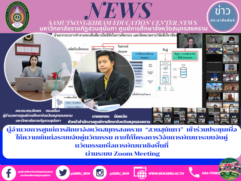วันพฤหัสบดีที่ 25 พฤศจิกายน 2564 เวลา 09.30 น. ผู้ช่วยศาสตราจารย์ ดร.ภญ.พิมพร ทองเมือง ผู้อำนวยการศูนย์การศึกษาจังหวัดสมุทรสงคราม มหาวิทยาลัยราชภัฏสวนสุนันทา พร้อมด้วยนายเอกชน น้อยเงิน หัวหน้าสำนักงานฯ เข้าร่วมการประชุมเพื่อให้ความเห็นต่อระบบจับคู่นวัตกรรม ภายใต้โครงการวิจัยการพัฒนาระบบจับคู่นวัตกรรมเพื่อการพัฒนาเชิงพื้นที่ ผ่านระบบ Zoom Meeting เพื่อระดมความคิดต่อระบบดังกล่าวที่คณะนักวิจัยได้พัฒนาขึ้นมาเพื่อประสิทธิภาพในราชการ (สปส.) เพื่อแก้ไขปัญหาในพื้นที่ มีความสำคัญของการจับคู่และสร้างความเชื่อมโยงระหว่างหน่วยงานและภาคส่วนที่เกี่ยวข้อง เพื่อส่งเสริมให้เกิดการใช้ประโยชน์จากเทคโนโลยี งานวิจัย และนวัตกรรมระหว่างผู้มีเทคโนโลยี (Technology Provider) อาทิ สถาบันวิจัย มหาวิทยาลัย นักวิจัย ผู้ถือครองสิทธิในทรัพย์สินทางปัญญา และผู้ต้องการใช้เทคโนโลยี (Technology Seeker) โดยมุ่งเน้นการพัฒนาระบบที่สามารถให้ผู้ปฏิบัติงานในระดับพื้นที่ สามารถค้นหางานวิจัยและนวัตกรรมจากระบบ และสามมารถนำไปเชื่อมโยงกับแนวทางการดำเนินงานที่มีอยู่ได้ทันที