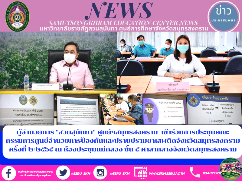 วันนี้(26 พ.ย.64) ผู้ช่วยศาสตราจารย์ ดร.ภญ.พิมพร ทองเมือง ผู้อำนวยการศูนย์การศึกษาจังหวัดสมุทรสงคราม มหาวิทยาลัยราชภัฏสวนสุนันทา เข้าร่วมประชุมและรายงานความคืบหน้าสถานการณ์ยาเสพติดและรายงานผลการดำเนินงานตามแผนปฏิบัติการป้องกันและปราบปรามยาเสพติด ประจำเดือนพฤศจิกายน 2564โดยมีนายสุพจน์ ยศสิงห์คำ รองผู้ว่าราชการจังหวัดสมุทรสงคราม รักษาราชการแทนผู้ว่าราชการจังหวัด เป็นประธานประชุมคณะกรรมการศูนย์อำนวยการป้องกันและปราบปรามยาเสพติดจังหวัด ณ ห้องประชุมชั้น 5 ศาลากลางจังหวัดฯ