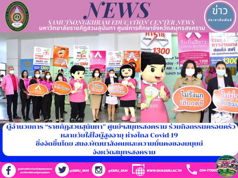 (29 พ.ย. 64) เวลา 09.00 น. ผู้ช่วยศาสตราจารย์ ดร.ภญ.พิมพร ทองเมือง ผู้อำนวยการศูนย์การศึกษาจังหวัดสมุทรสงคราม มหาวิทยาลัยราชภัฏสวนสุนันทา ร่วมกิจกรรมครอบครัวหลายวัยใส่ใจผู้สูงอายุ ห่างไกล Covid-19 ซึ่งจัดขึ้นโดย สนง.พัฒนาสังคมและความมั่นคงของมนุษย์ จังหวัดสมุทรสงคราม มีทุกข์ พบปัญหา โทรมาที่ 1300 สายด่วน พม.