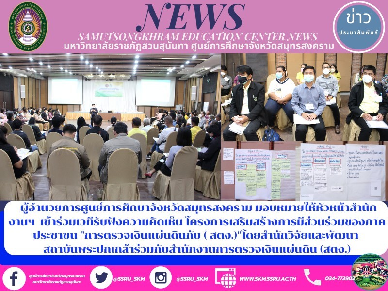 วันจันทร์ที่ 29 พฤศจิกายน 2564 ณ กนกรัตน์รีสอร์ท จังหวัดสมุทรสงคราม ผู้ช่วยศาสตราจารย์ ดร.ภญ.พิมพร ทองเมือง ผู้อำนวยการศูนย์การศึกษาจังหวัดสมุทรสงคราม มหาวิทยาลัยราชภัฏสวนสุนันทา ได้มอบหมายให้ นายเอกชน น้อยเงิน หัวหน้าสำนักงานศูนย์ฯ เข้าร่วมเวทีรับฟังความคิดเห็น โครงการเสริมสร้างการมีส่วนร่วมของภาคประชาชน "การตรวจเงินแผ่นดินกับ ( สตง.)"โดยสำนักวิจัยและพัฒนา สถาบันพระปกเกล้าร่วมกับสำนักงานการตรวจเงินแผ่นดิน (สตง.) ได้จัดดำเนินโครงการศึกษาวิจัยดังกล่าวฯโดยมีวัตถุประสงค์เพื่อทราบแนวคิด หลักการ กฎหมาย กลไก และค้นหาต้นแบบกิจกรรม รูปแบบ และวิธีการที่เหมาะสมกับสำนักงานตรวจเงินแผ่นดิน ที่ทำให้เกิดการมีส่วนร่วมของประชาชนและภาคส่วนต่างๆ ในการดูแลรักษาแผ่นดินและทรัพย์สินของรัฐ ซึ่งเป็นส่วนหนึ่งในการส่งเสริมการตรวจเงินแผ่นดินให้เกิดผลสัมฤทธิ์และมีประสิทธิภาพเป็นไปตามนโยบายการตรวจเงินแผ่นดินที่คณะกรรมการตรวจเงินแผ่นดินได้กำหนดไว้ในด้านการส่งเสริมการศึกษาวิจัยที่มุ่งเน้นการพัฒนางานตรวจเงินแผ่นดินให้เกิดประสิทธิภาพมากขึ้น โดยเฉพาะการปลูกฝังจิตสำนึกในการสอดส่องดูแลรักษาเงินแผ่นดินและสาธารณสมบัติ ฯ ทั้งนี้ เพื่อเป็นการให้ผู้ที่เข้าร่วมอบรมได้ทราบถึงบทบาท หน้าที่ และอำนาจที่สำคัญของสำนักงานการตรวจเงินแผ่นดินที่มีต่อสังคมและประเทศชาติ มีความรู้ความเข้าใจ และตระหนักในความสำคัญของการปกป้องดูแลเงินแผ่นดินและทรัพย์สินของรัฐรวมทั้งเข้าใจแนวทางการมีส่วนร่วมในการดูแลรักษาเงินแผ่นดินและทรัพย์สินของรัฐ เพื่อส่งเสริมผลักดันให้ทุกภาคส่วนตระหนักและมีส่วนร่วมในการดูแลการใช้จ่ายเงินแผ่นดินและทรัพย์สินของชาติให้เกิดประโยชน์สูงสุด โดยมีแผนการรวบรวมข้อมูลด้วยการจัดเวทีรับฟังความคิดเห็นของประชาชนและภาคส่วนต่างๆจำนวน 5 ภูมิภาค โดยมีจังหวัดที่เป็นตัวแทนภูมิภาค ดังนี้ จังหวัดสมุทรสงคราม จังหวัดสตูล จังหวัดชลบุรี จังหวัดอุดรธานี และจังหวัดเชียงใหม่