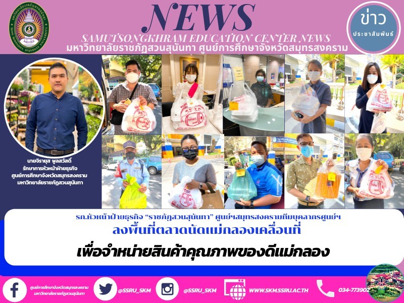 รก.หัวหน้าฝ่ายธุรกิจ “ราชภัฏสวนสุนันทา” ศูนย์ฯสมุทรสงครามทีมบุคลากรศูนย์ฯลงพื้นที่ตลาดนัดแม่กลองเคลื่อนที่ เพื่อจำหน่ายสินค้าคุณภาพของดีขึ้นชื่อลือชา เมืองแม่กลอง อาทิเช่น ปลาทูนึ่งแม่กลอง,กระปิเคยตาดำ,ไข่ไก่,ชะคราม,น้ำตาลมะพร้าว,คุกกี้ถั่วรูปปลาทู และสินค้าอื่นๆอีกหลายรายการรับออเดอร์ต่อเนื่อง บริการนำส่งความอร่อยทุกท่าน