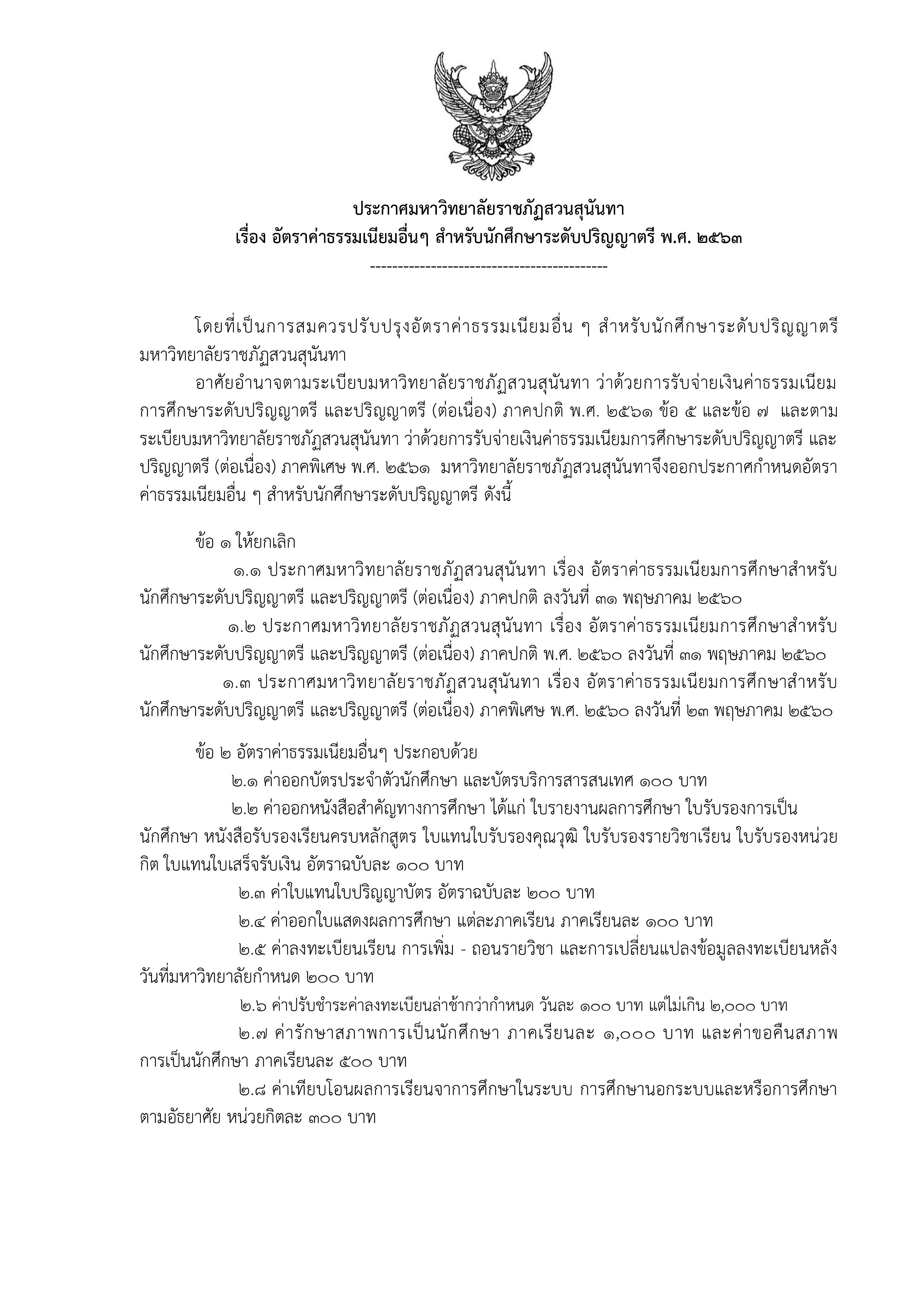 > ประกาศมหาวิทยาลัยราชภัฏสวนสุนันทา เรื่อง อัตราค่าธรรมเนียมอื่นๆ สำหรับนักศึกษาระดับปริญญาตรี พ.ศ. ๒๕'๖๓