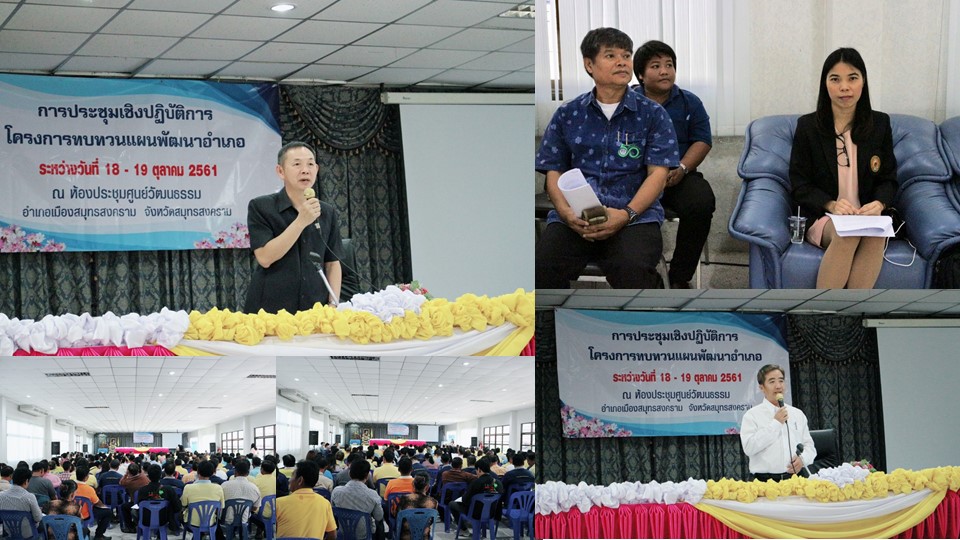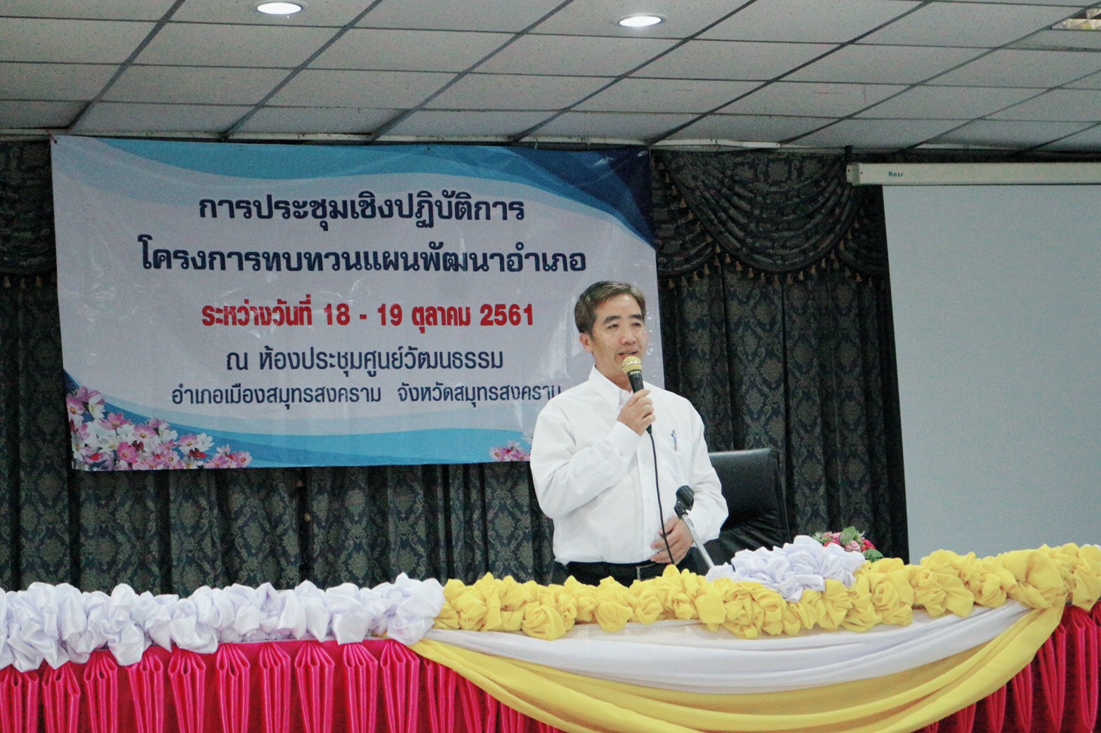 (18 ต.ค.61) เวลา 09.30 น. ผู้ช่วยศาสตราจารย์ ดร.ภญ.พิมพร ทองเมือง ผู้อำนวยการศูนย์การศึกษาจังหวัดสมุทรสงคราม มหาวิทยาลัยราชภัฏสวนสนันทา เข้าร่วม โครงการทบทวนแผนพัฒนาอำเภอ ระหว่างวันที่ 18-19 ตุลาคม 2561 เพื่อให้การปรับปรุงแผนพัฒนาอำเภอ 4 ภายใต้ยุทธศาสตร์จังหวัดกรอบยุทธศาสตร์ 20 ปี แผนการปฏิรูปประเทศ 11 ด้าน แผนพัฒนาเศรษฐกิจและสังคมแห่งชาติ ฉบับที่ 12 เพื่อประมวลปัญหาและความต้องการของประชาชนในพื้นที่ ผ่านการประสานข้อมูลจากแผนพัฒนาหมู่บ้าน แผนชุมชนระดับตำบล และแผนพัฒนาท้องถิ่น รวมทั้งแผนงาน/โครงการ จากภาคส่วนต่างๆ ในพื้นที่ เพื่อปรับปรุง ทบทวน และจัดทำแผนพัฒนาอำเภอ 5 ปี เเล้วนำเสนอโครงการเพื่อบรรจุในแผนปฏิบัติราชการปรพจำปี พ.ศ. 2563 ในโอกาสนี้ รองศาสตราจารย์ชัยศรี ธาราสวัสดิ์พิพัฒน์ คณะวิทยาศาสตร์และเทคโนโลยี มหาวิทยาลัยราชภัฏสวนสุนันทา ได้เข้าร่วมเป็นวิทยากรบรรยาย ณ ศูนย์วัฒนธรรมอำเภอเมืองสมุทรสงคราม