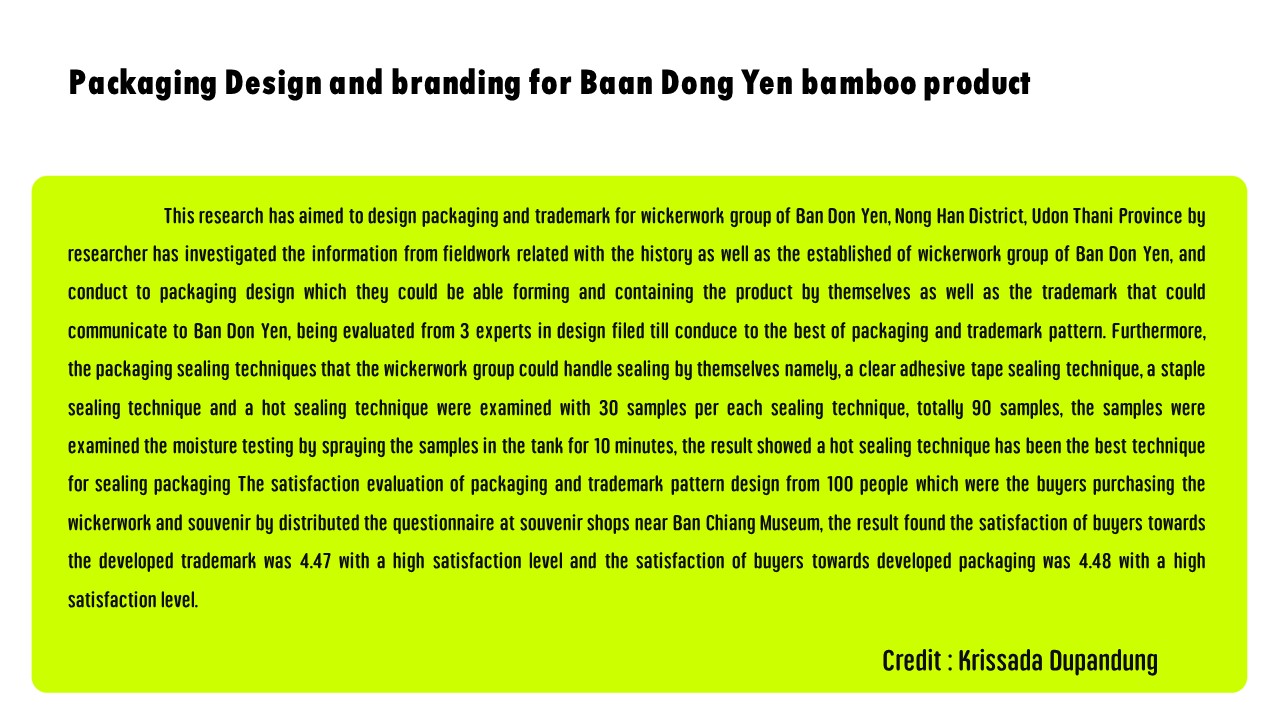 This research has aimed to design packaging and trademark for wickerwork group of Ban Don Yen, Nong Han District, Udon Thani Province by researcher has investigated the information from fieldwork related with the history as well as the established of wickerwork group of Ban Don Yen, and conduct to packaging design which they could be able forming and containing the product by themselves as well as the trademark that could communicate to Ban Don Yen, being evaluated from 3 experts in design filed till conduce to the best of packaging and trademark pattern. Furthermore, the packaging sealing techniques that the wickerwork group could handle sealing by themselves namely, a clear adhesive tape sealing technique, a staple sealing technique and a hot sealing technique were examined with 30 samples per each sealing technique, totally 90 samples, the samples were examined the moisture testing by spraying the samples in the tank for 10 minutes, the result showed a hot sealing technique has been the best technique for sealing packaging The satisfaction evaluation of packaging and trademark pattern design from 100 people which were the buyers purchasing the wickerwork and souvenir by distributed the questionnaire at souvenir shops near Ban Chiang Museum, the result found the satisfaction of buyers towards the developed trademark was 4.47 with a high satisfaction level and the satisfaction of buyers towards developed packaging was 4.48 with a high satisfaction level.